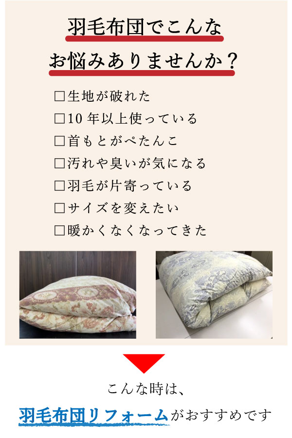 10年以上使っている場合や、10年未満でも保温力や嵩が減ってきたり羽毛布団の不具合がある時におすすめ! |