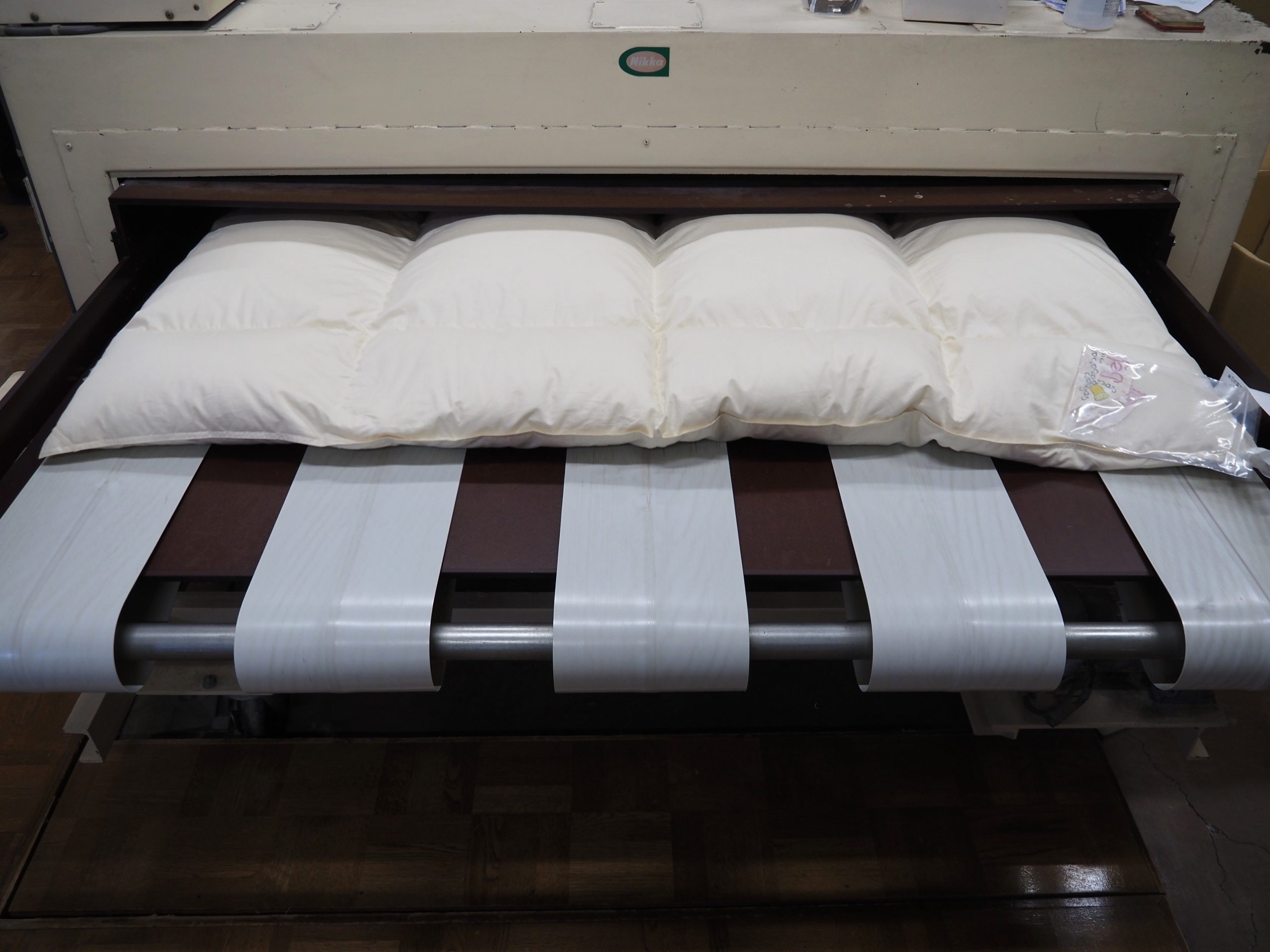ゆったりスペースの中で、150℃の高温で短時間乾燥して、羽毛に付着している菌も完全に取り除きます