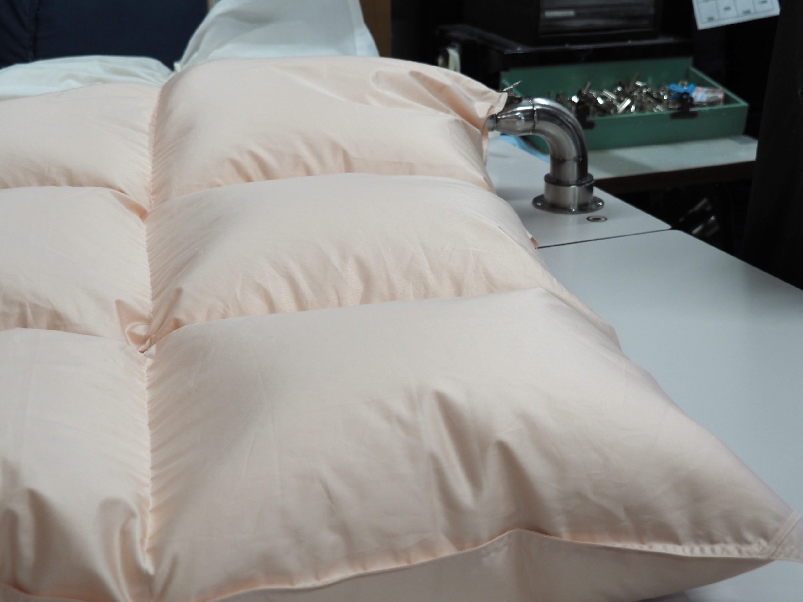 身体に沿いやすいようにキルティング方法を変えたり、二層式の暖かい仕様に変えたり、身体に当たる部分の羽毛を増やしたり、様々な仕様の加工が出来ます。