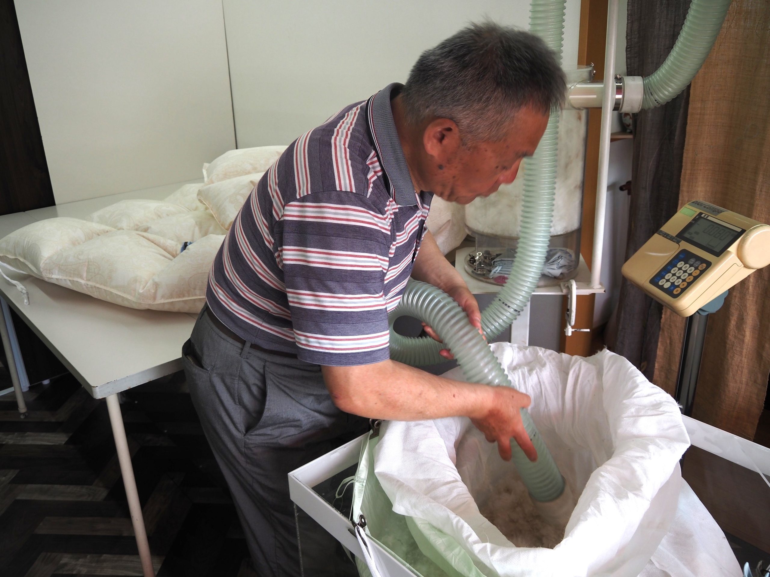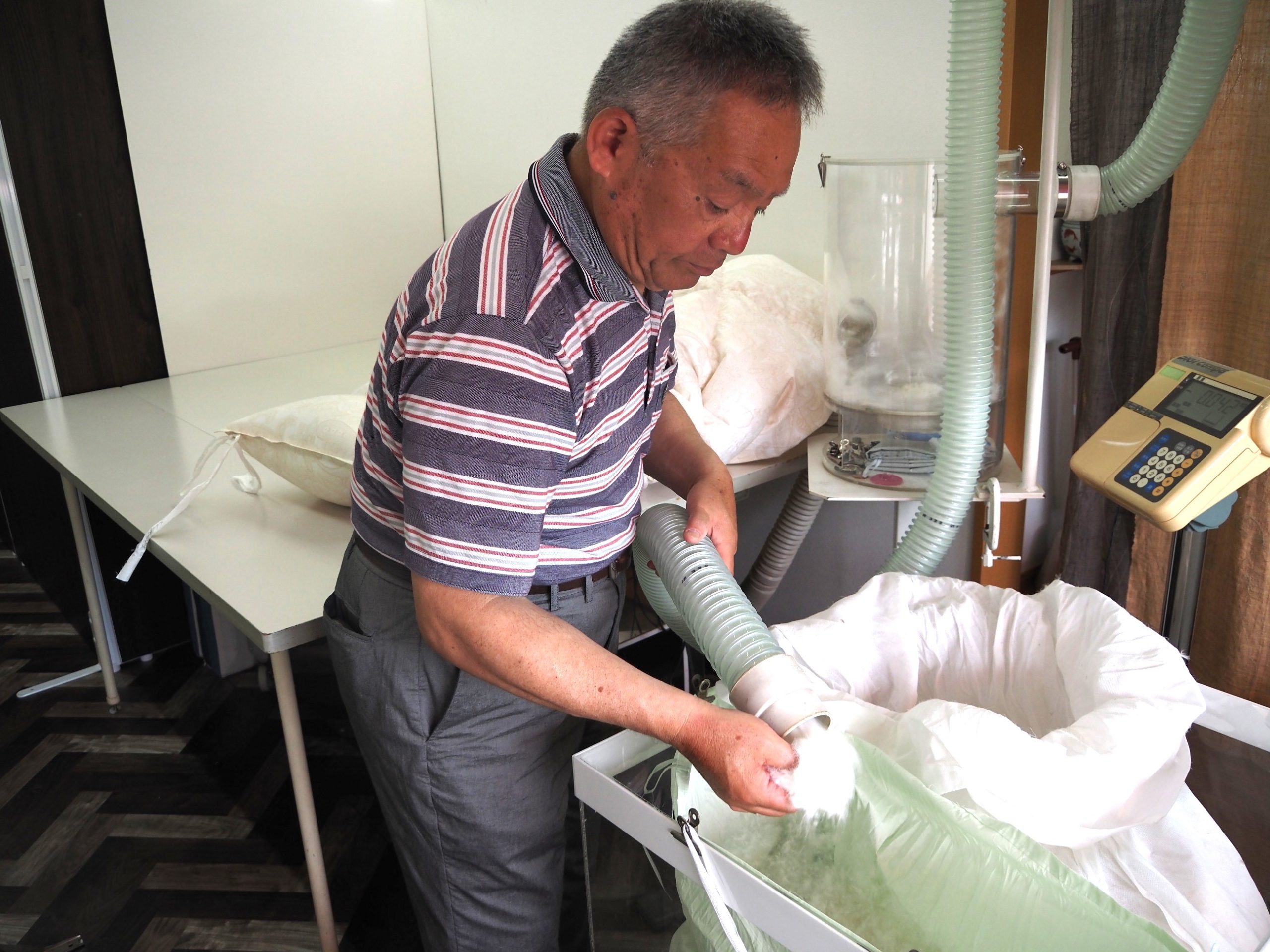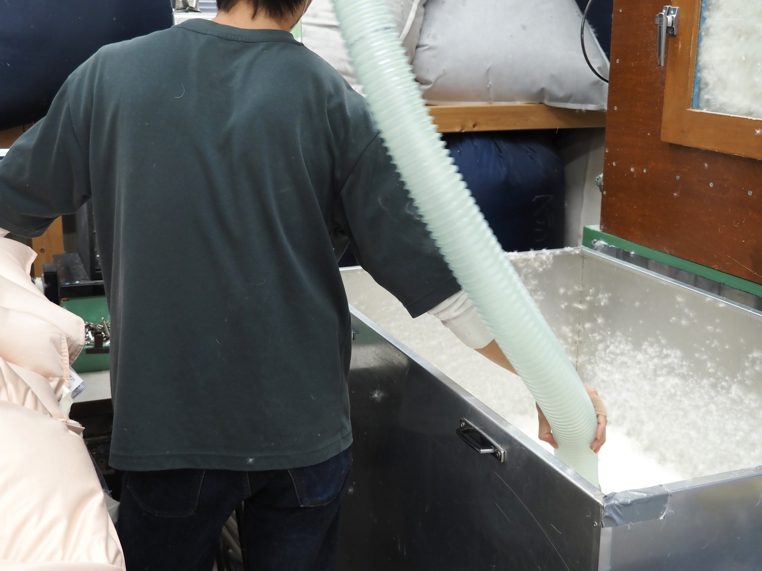 羽毛工房で羽毛の状態を確認しながら1マスずつ量を測りながら羽毛を吹き込みます