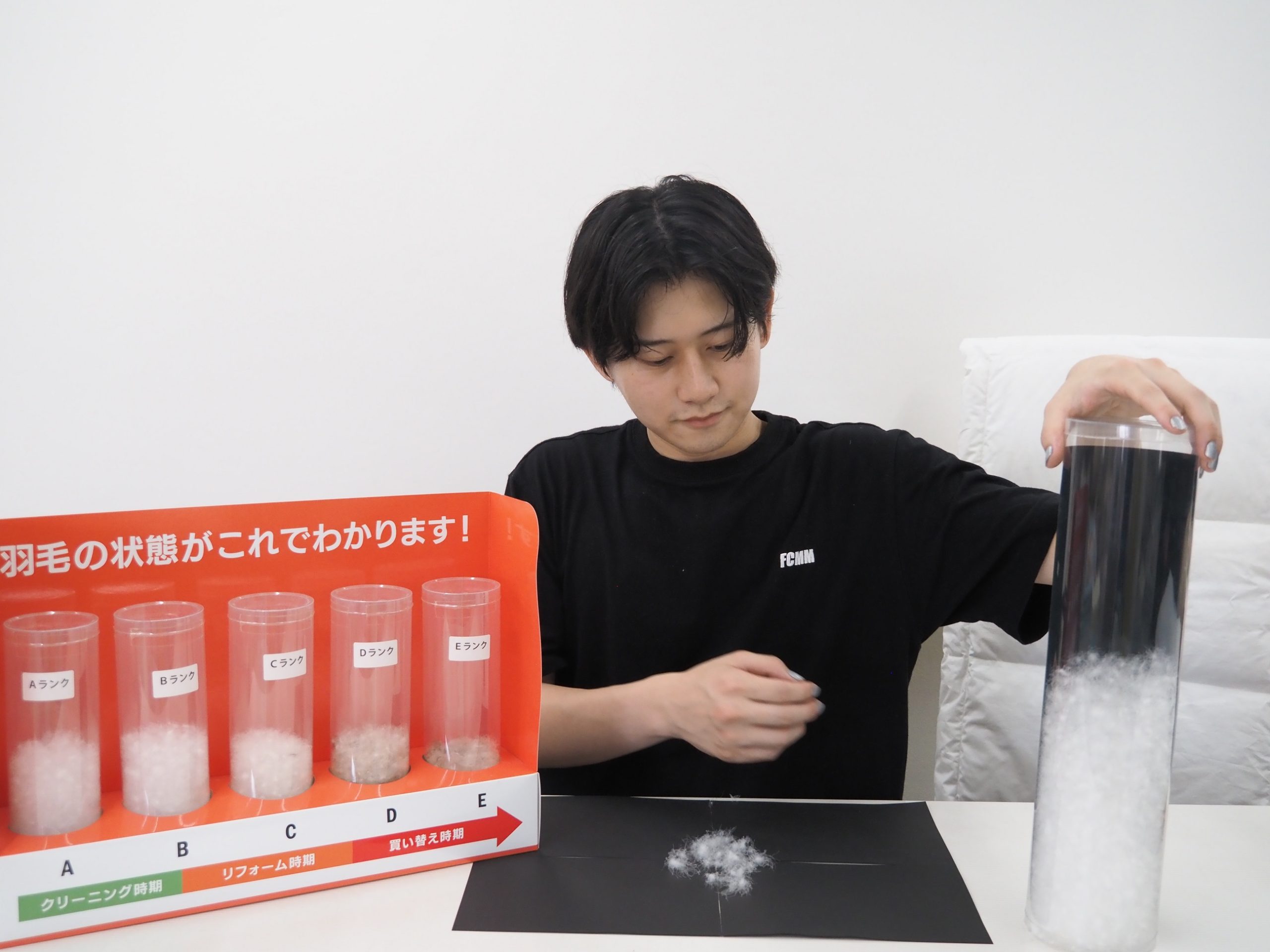 当店では、羽毛診断を無料でしており、ダウンプロフェッサーがお客様と一緒に羽毛の状態を確認させて頂いております。 -