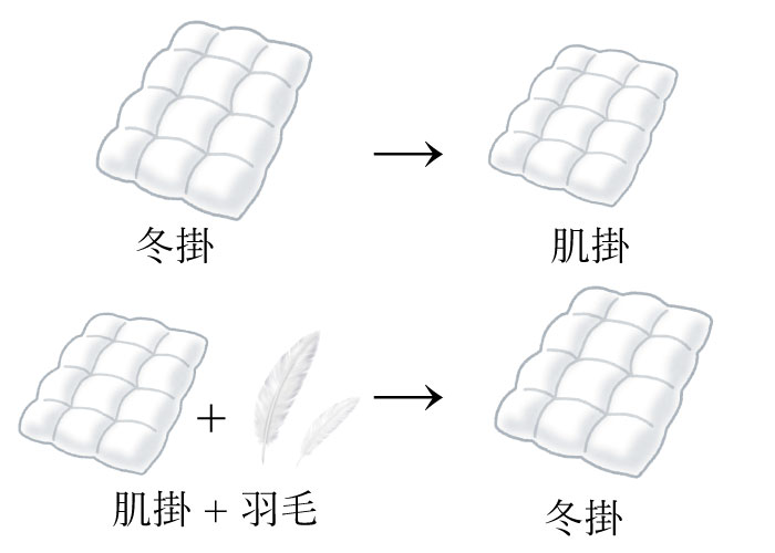 冬用の掛布団を合掛けや肌掛けのように薄く作りかえたり、羽毛の量を増やして厚く作り変えることが出来ます。
