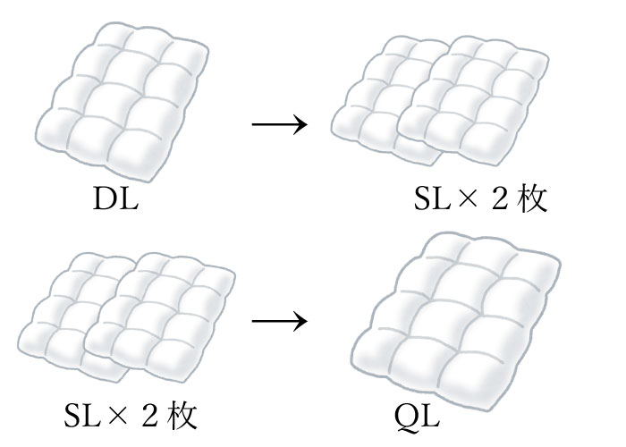 ダブルサイズの羽毛布団1枚からシングルサイズの羽毛布団を2枚に作り変えたり、シングルサイズの羽毛布団2枚からクイーンサイズの羽毛布団1枚に作り変えるなど枚数の増減が出来ます。
