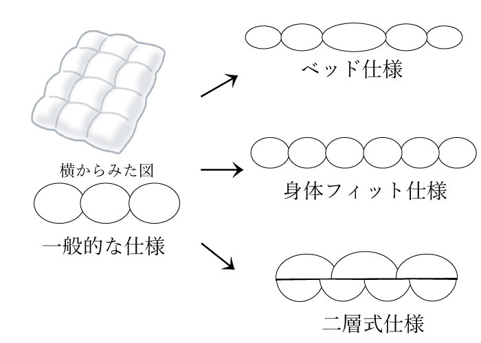 マンションか一軒家などの住環境、暑がり寒がりなどの体質等を踏まえ、自分に必要な厚みに変えることが可能です。 -