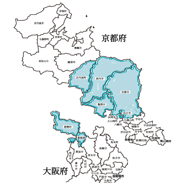 | 京都府 | 亀岡市、南丹市(八木町、園部町、日吉町、美山町)、船井郡京丹波町、京都市(右京区、西京区、北区、中京区、左京区、上京区、下京区、南区、東山区、伏見区、山科区)、向日市、長岡京市、大山崎町、八幡市、久御山町、宇治市、城陽市、精華町、綾部町、福知山市、舞鶴市、宮津市、京丹後市 |