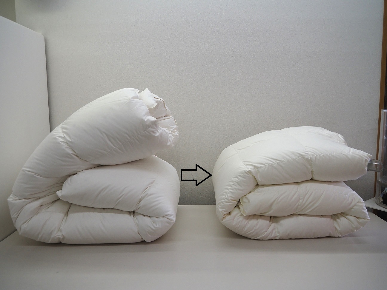 洗浄・パワーアップ加工をするだけで同じ1gの羽毛でも倍近い嵩に元通り!!!
