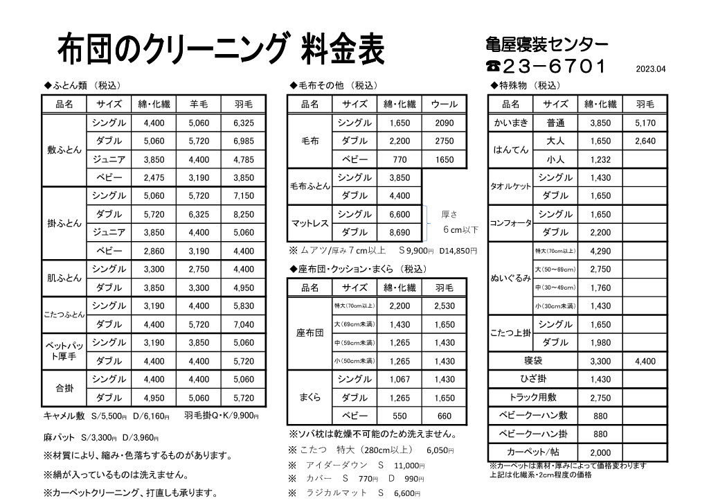 布団をお預かりする際に、クリーニングが必要かどうかやお手入れの事、布団の分からないアレコレも何でもお聞きいただけます。