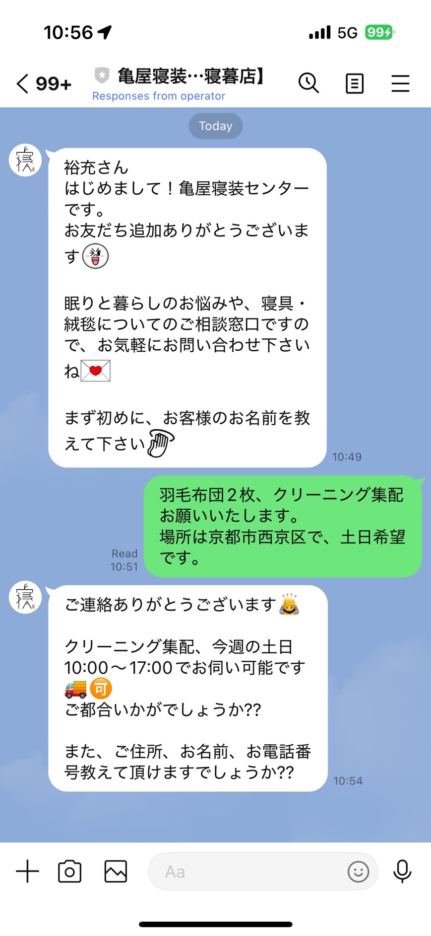 下記より友だち追加してメッセージにて、「布団の種類と枚数・場所・希望日時」をお送り下さい。