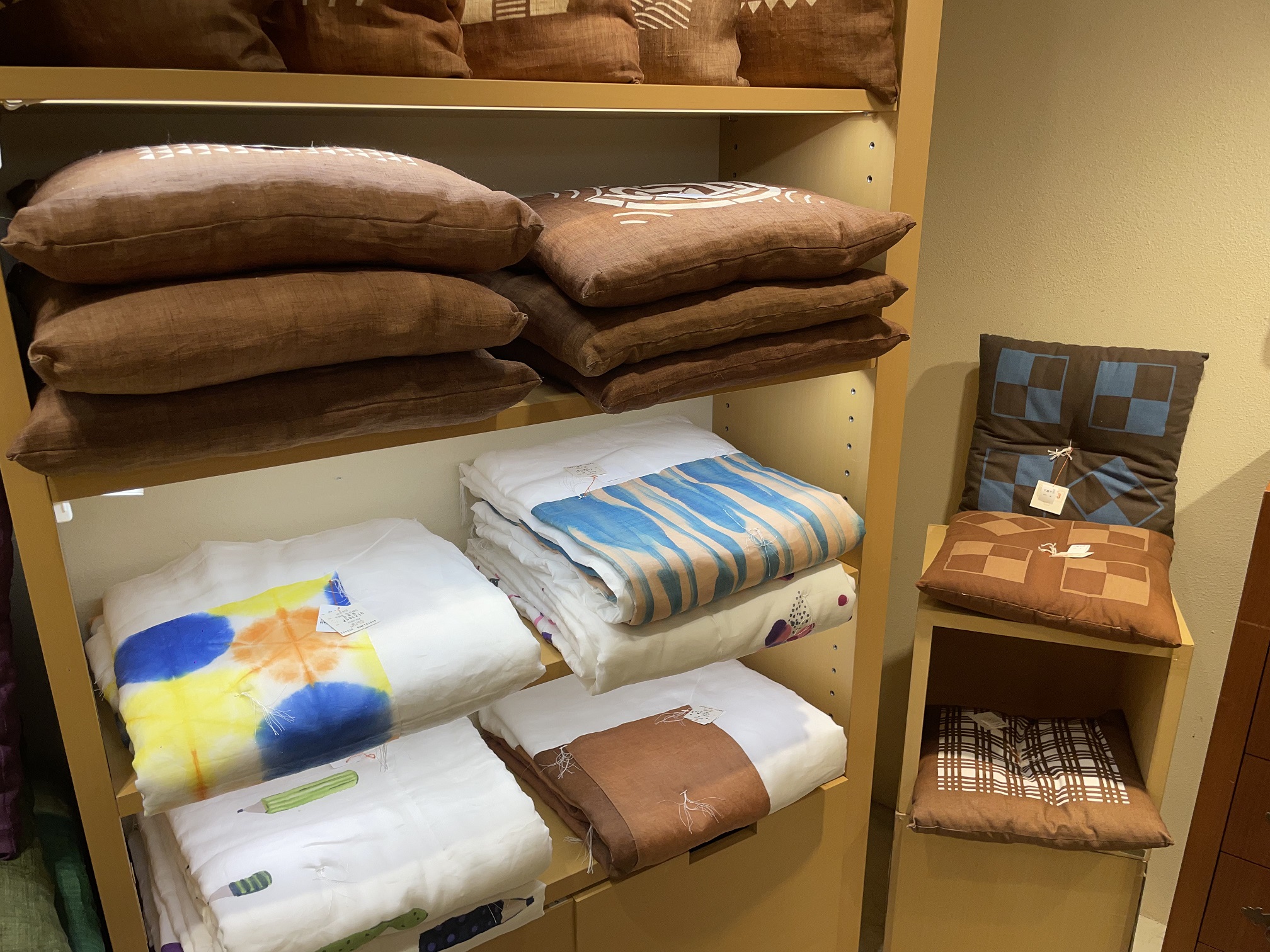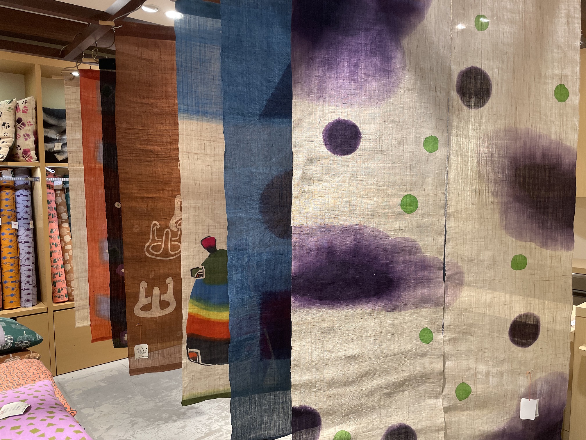 綿の染め生地から麻暖簾などなど様々な商品を展示してお待ちしております。
