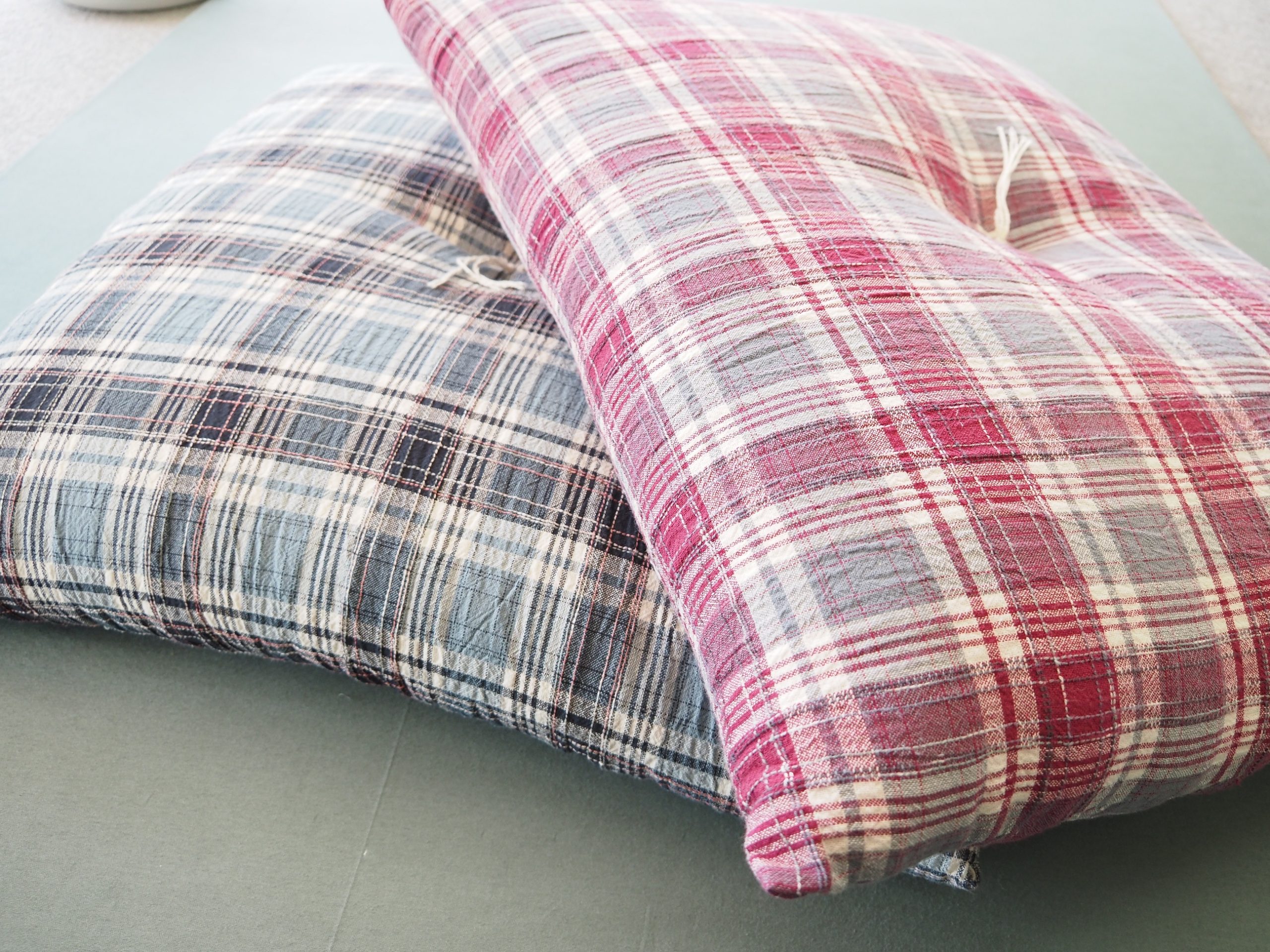 宮崎さんが柿渋染めや藍染め、臈纈染め、手絞り、刺し子等を施した綿や麻の生地に、当店の職人が一枚一枚手作業で綿入れをします。サイズ等もオーダー出来て、インテリアとして使うことも。
