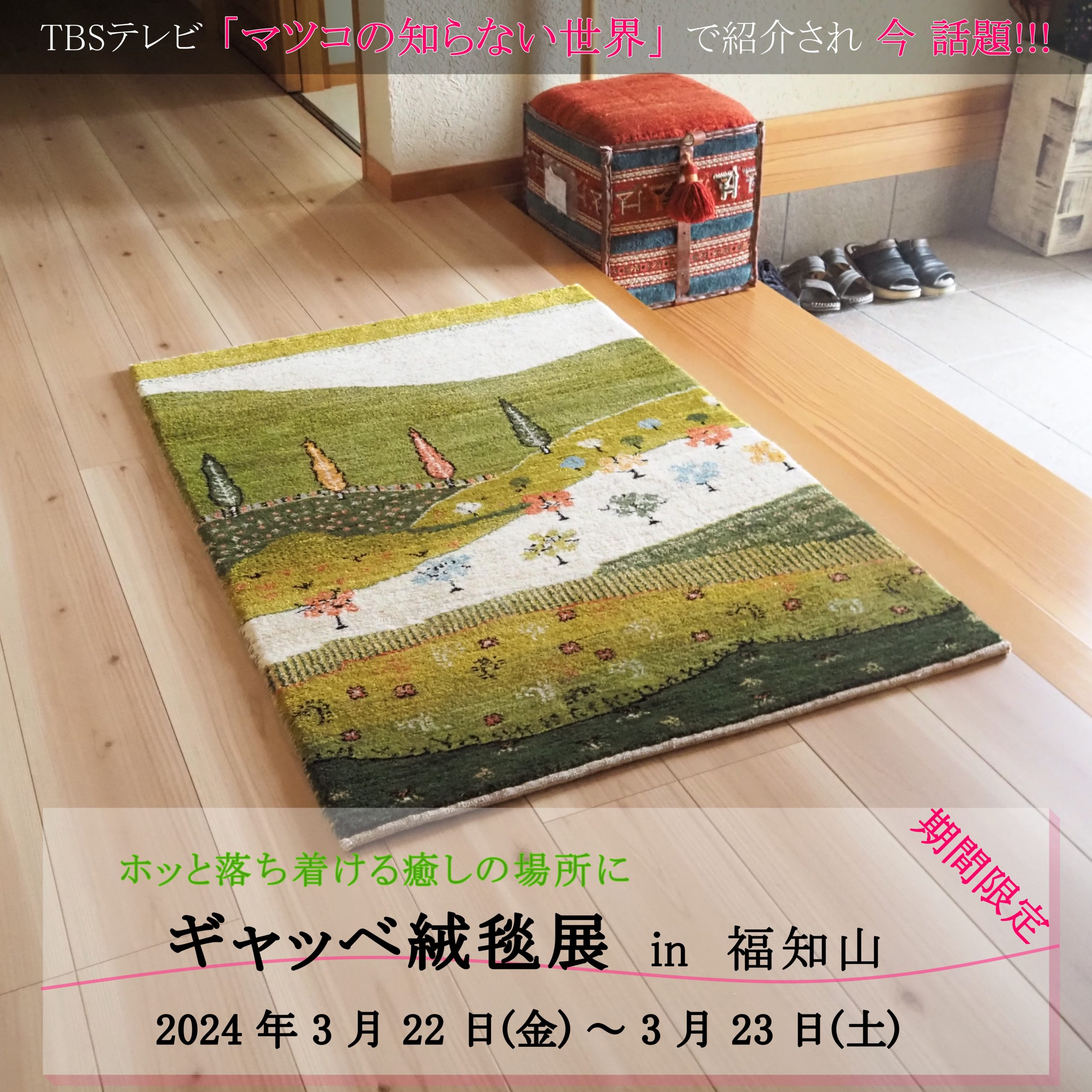 2024年3月22日(金)~3月23日(土)の期間限定で、京都府福知山市の市民交流プラザふくちやま 3F ギャラリーにて「ペルシャ&ギャッベ絨毯展」を開催いたします。椅子の上に敷くミニサイズから大きなリビングサイズまで、ゾランバリギャッベや本場のペルシャ絨毯を沢山展示しますので是非お越し下さいませ。