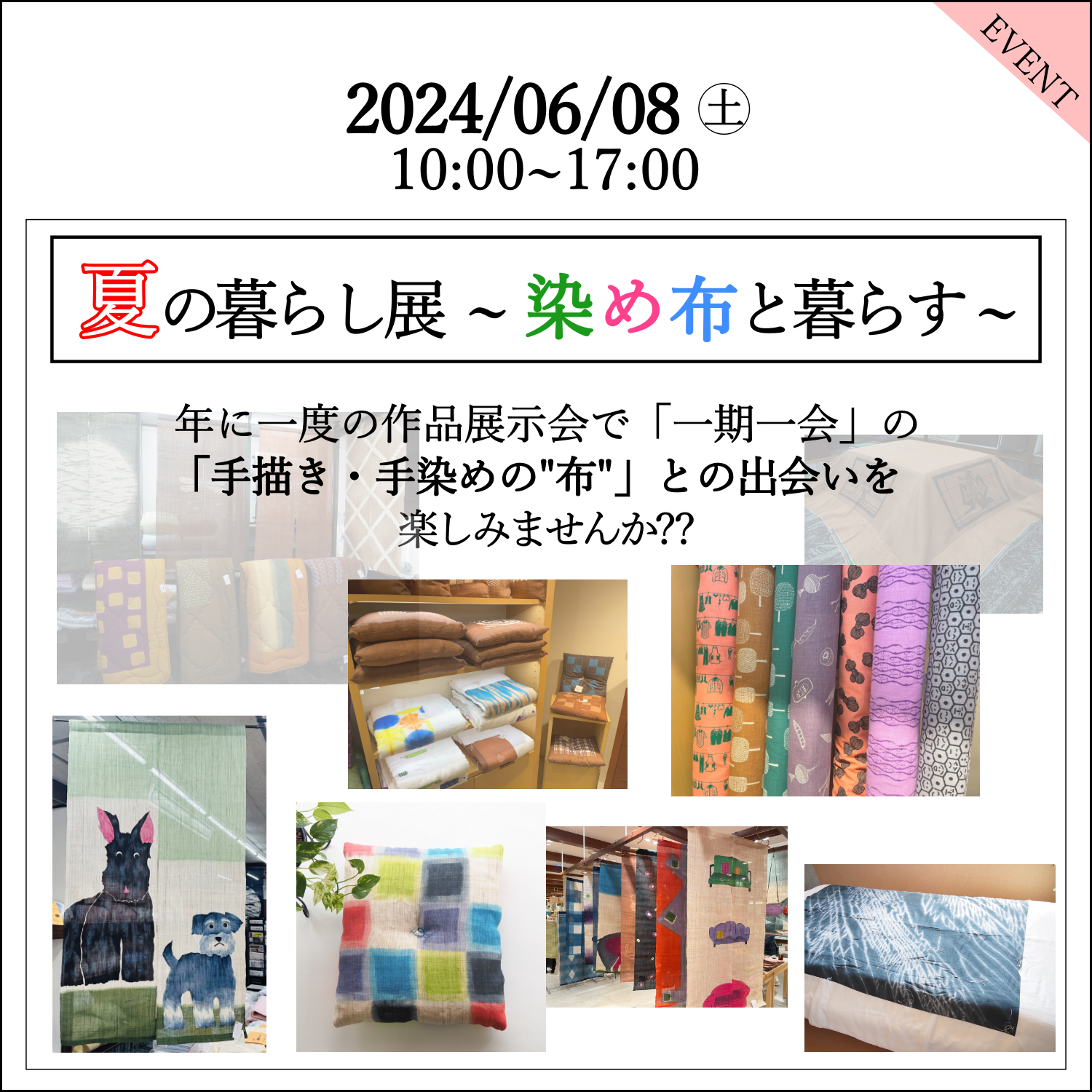 2024年6月8日(土)10:00∼17:00で、夏の暮らし展 ∼染め布と暮らす∼ を開催。染織作家 宮崎登志雄さんも緊急来店!!!
