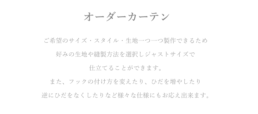 既製品は一般的に両開きのカーテンだけですが、オーダーカーテンはシェード、フリルをつけたりできます。また、出窓に適したスタイルにしたり様々なスタイルで縫製することができるので、お部屋のイメージや使い勝手に合わせたオーダーカーテンをつくることができます。