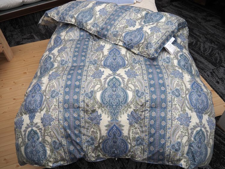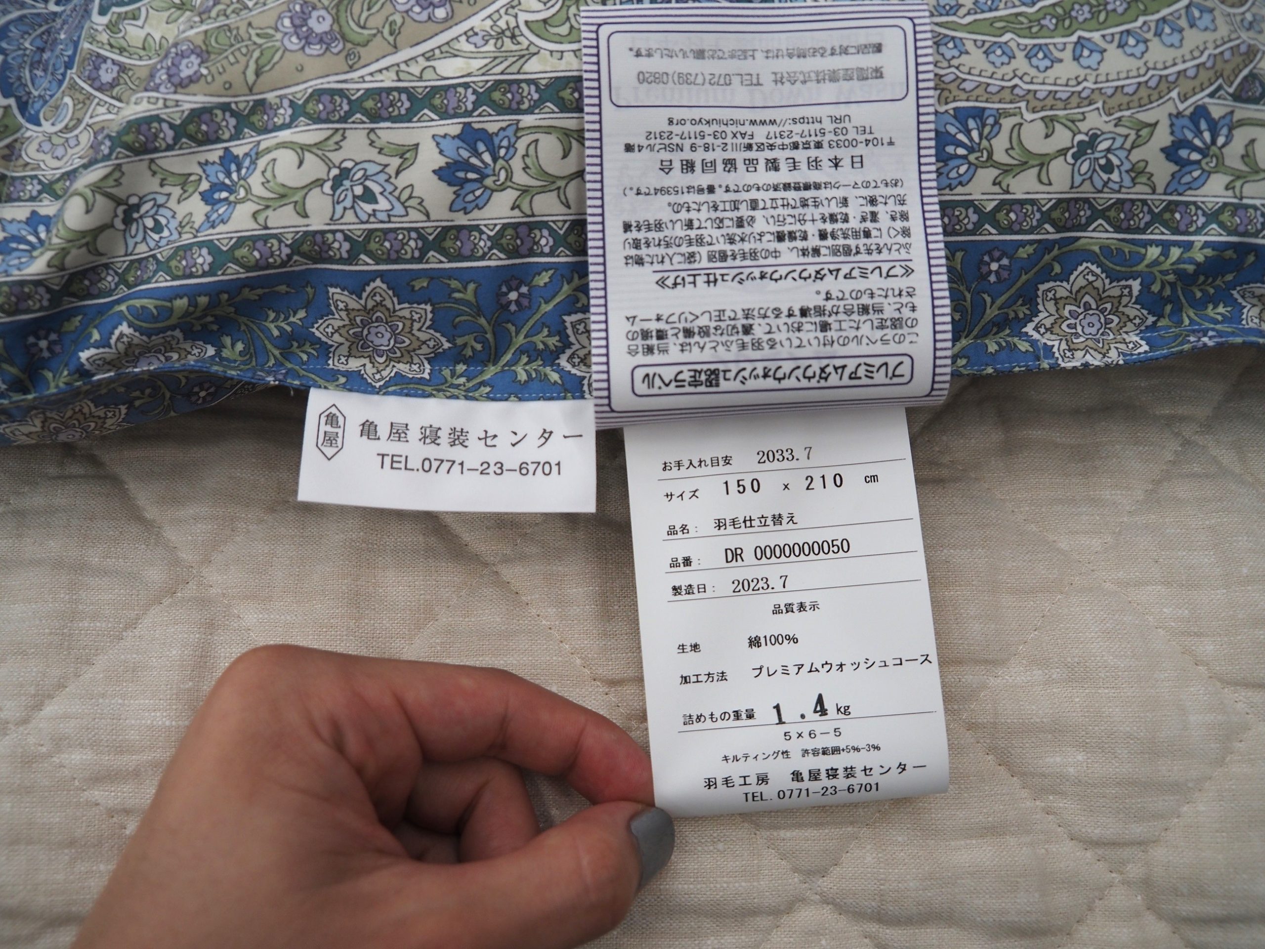 ラベルは真っ白でどんな羽毛が何グラム入っているか正確には分からないですが、シルク生地の同じようなものを新しく買おうとすると2,30万は軽くしてしまうのでリフォームされるほうが絶対お得です。シルクより耐久力が高く破れにくい綿100%の生地をご提案させていただきました。