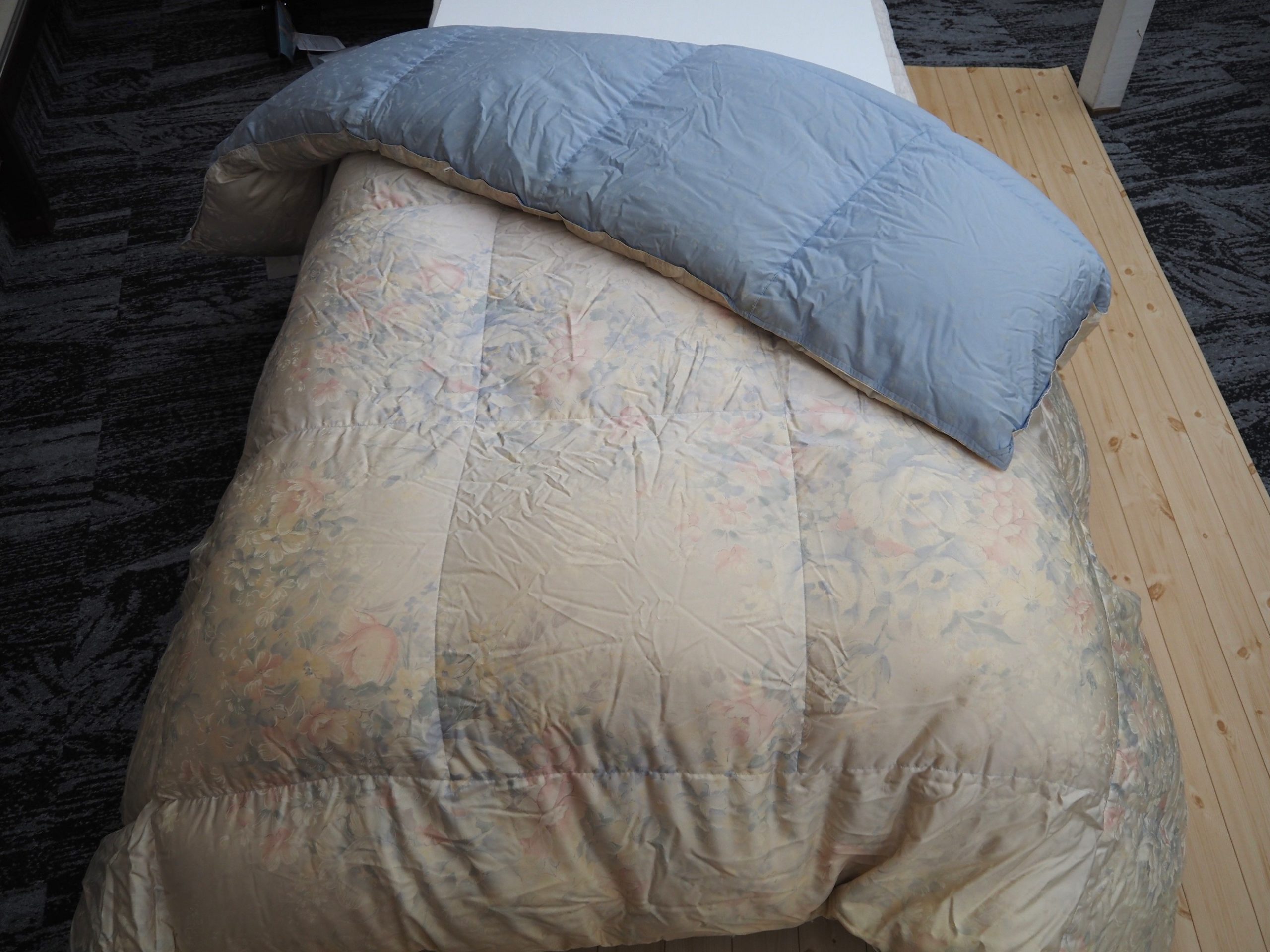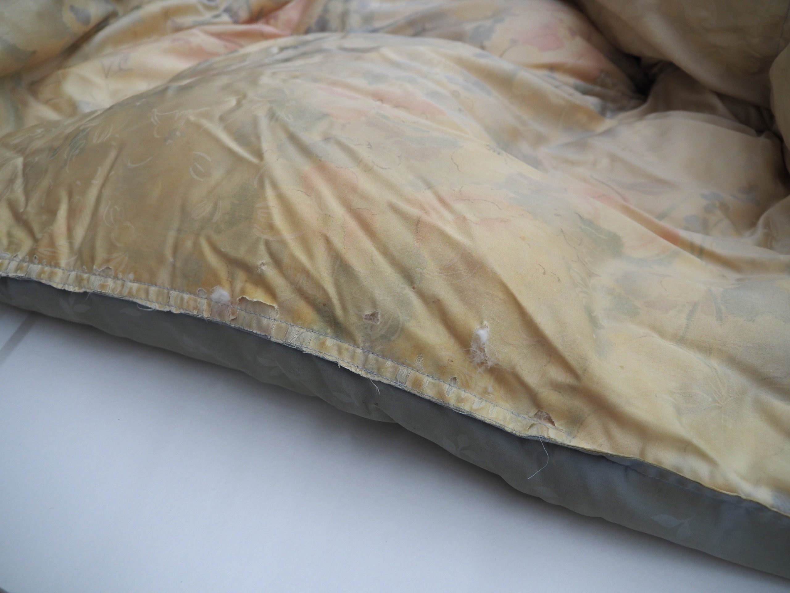 お預かりしたのは、シルク生地が使われたダブルの羽毛布団。長年使われてたこともあり、ラベルは真っ白で見えなくなり生地もところどころ破れていました。
