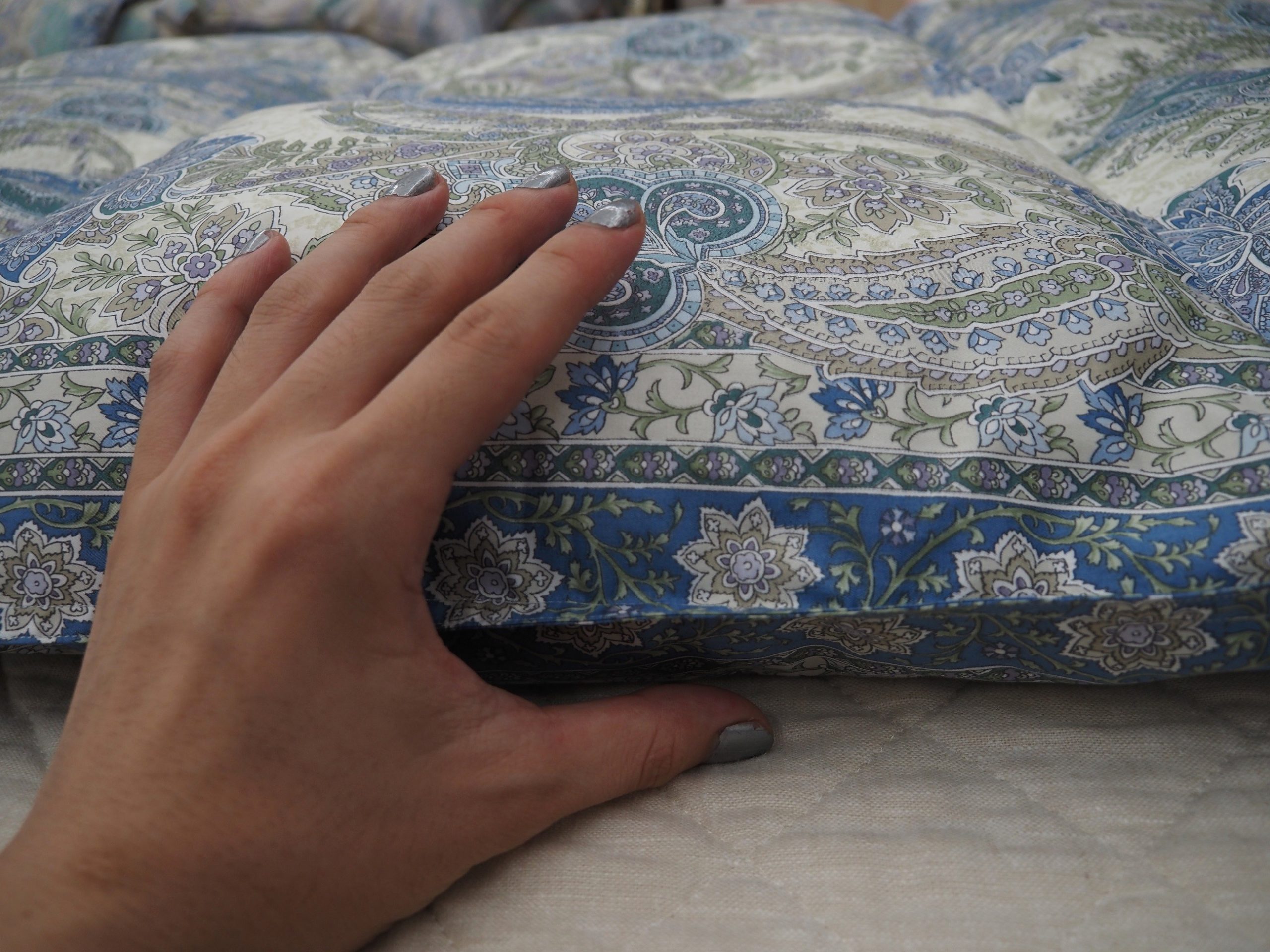 シルクの生地の場合、破れやすいため生地が2重になっていて重たいですが、お作りさせて頂いたのは綿100%の生地で作ったのでとても軽い羽毛布団に仕上がりました。