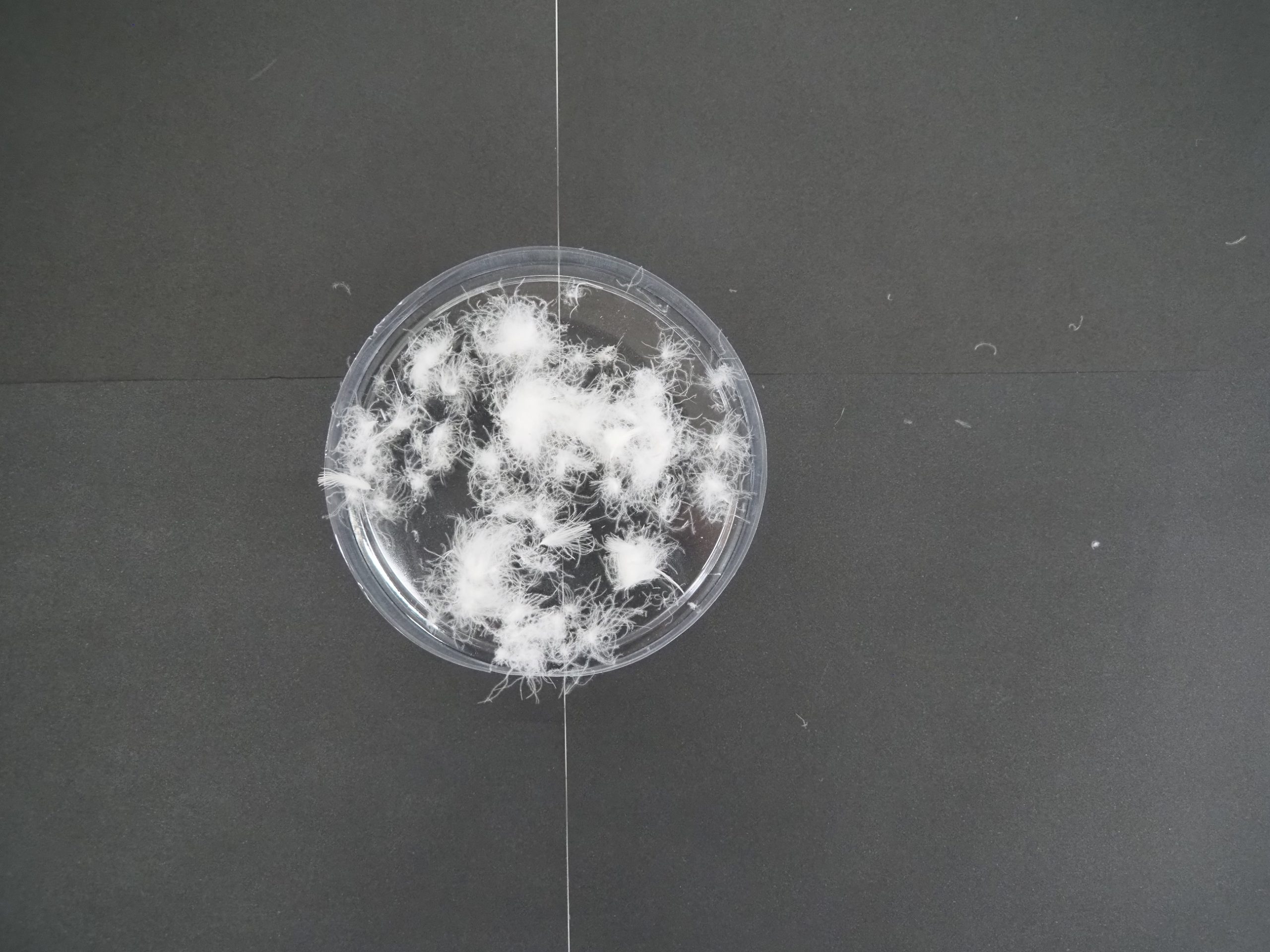 羽毛を取り出すと、グースの羽毛ですがかなり傷んでいる様子。ファイバー(ちぎれた羽毛)も多く、かなり長い間使われた様子です。