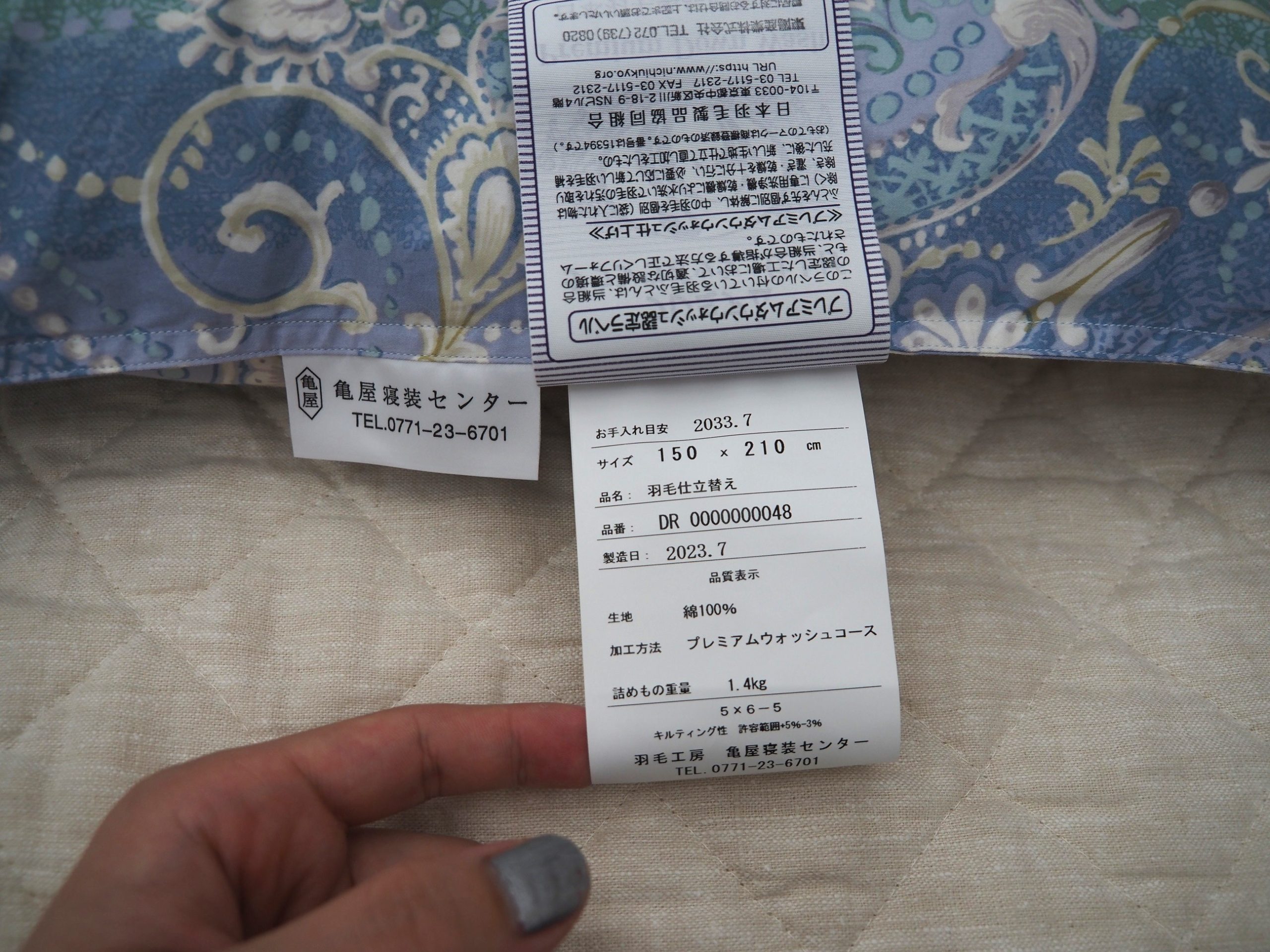 お預かりした羽毛布団は、京都金桝(ABLE)のホワイトグースダウン95%がたっぷり1.4kg入っていました。