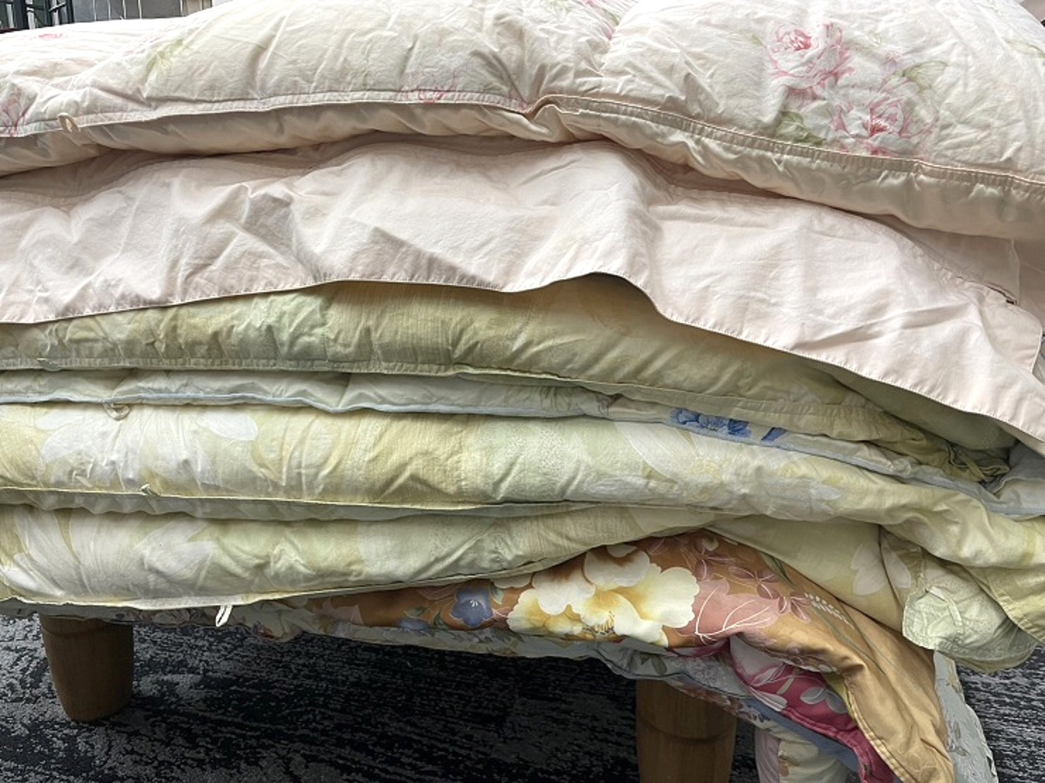 お持ち頂いたのは、羽毛布団から羽毛のベッドカバーまで、なんと、、全部で11枚。重ねてみるとすごいボリュームでした。
