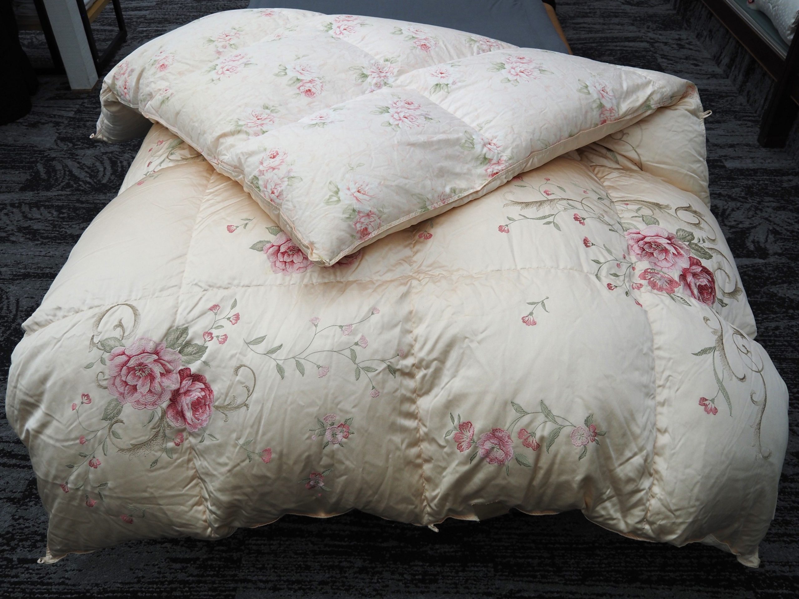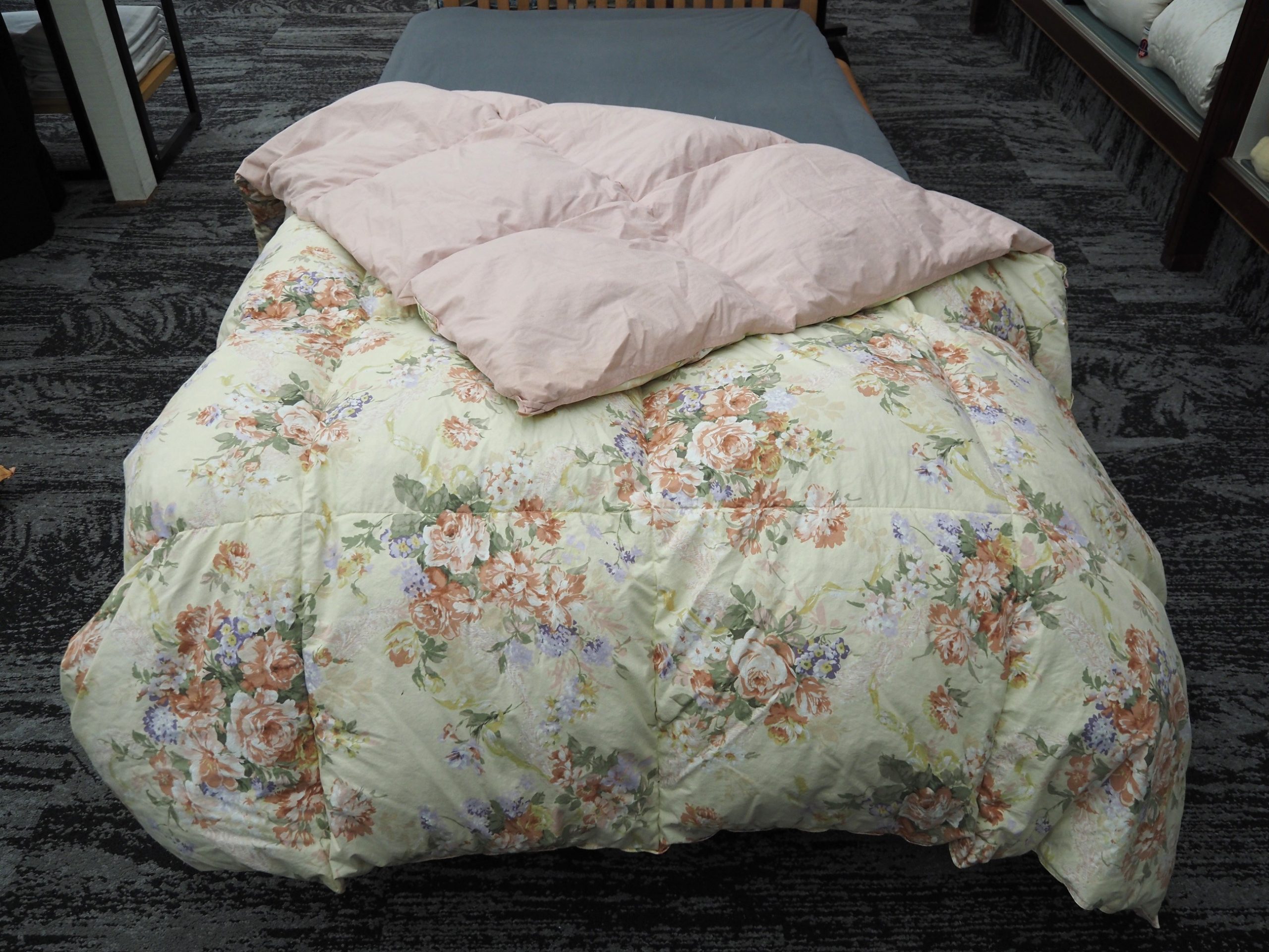 こちらは、お客様曰く一番古いと仰られていました。キルトを見ても古い。というのは分かります。こちらもラベルが無くなってましたが、恐らくダウン率80%ぐらい、、。こちらは、ダウン率からしてリフォーム出来ないこともないですが、無理にする必要もないという判断。
