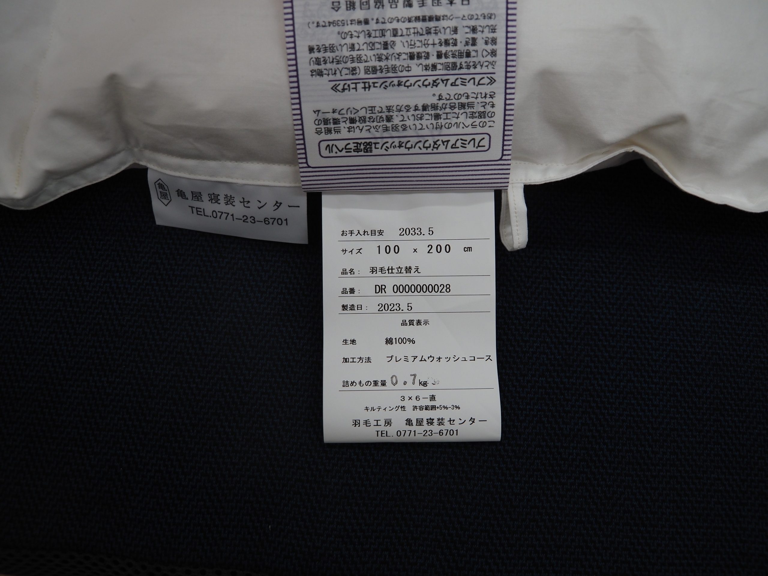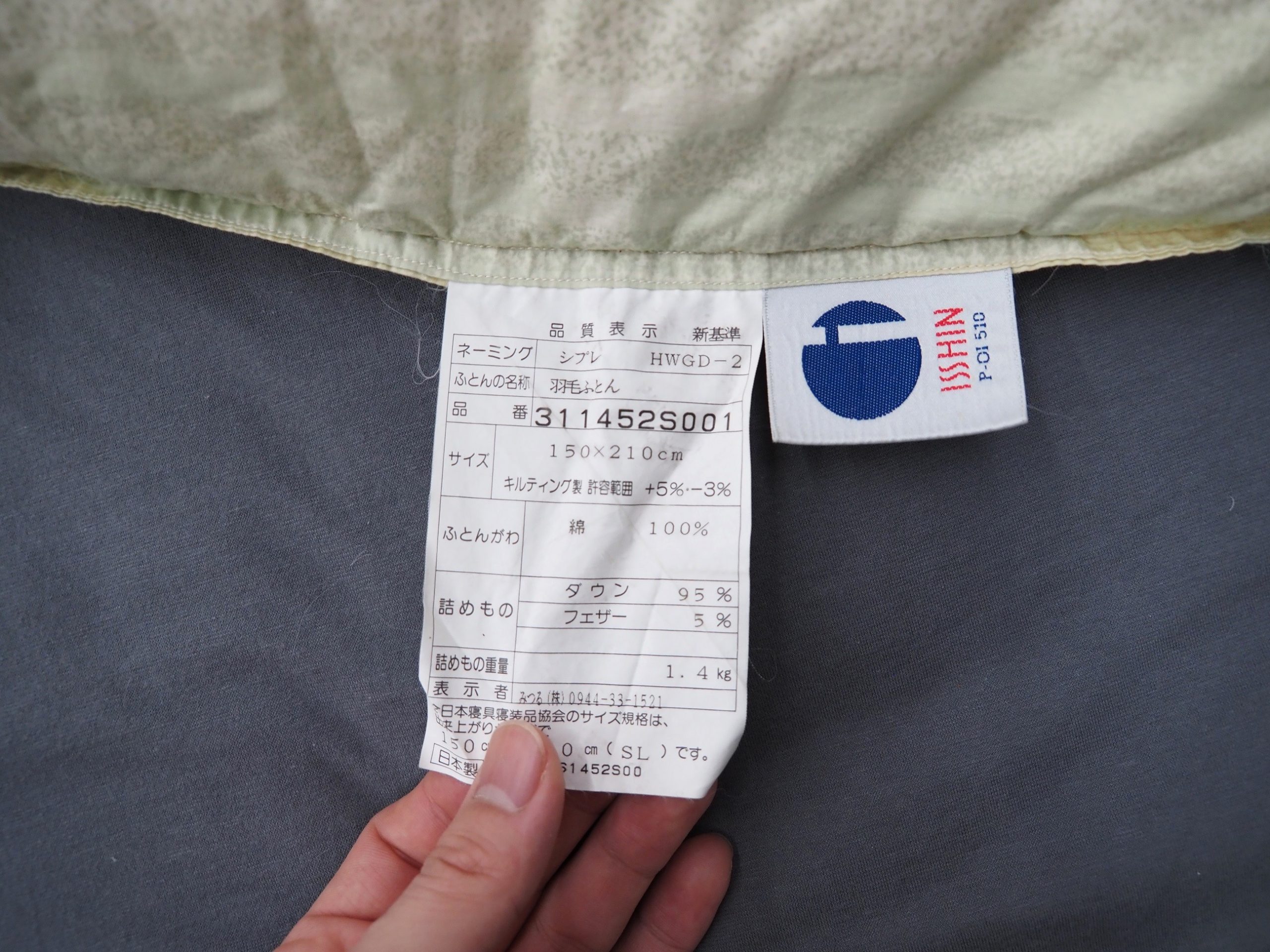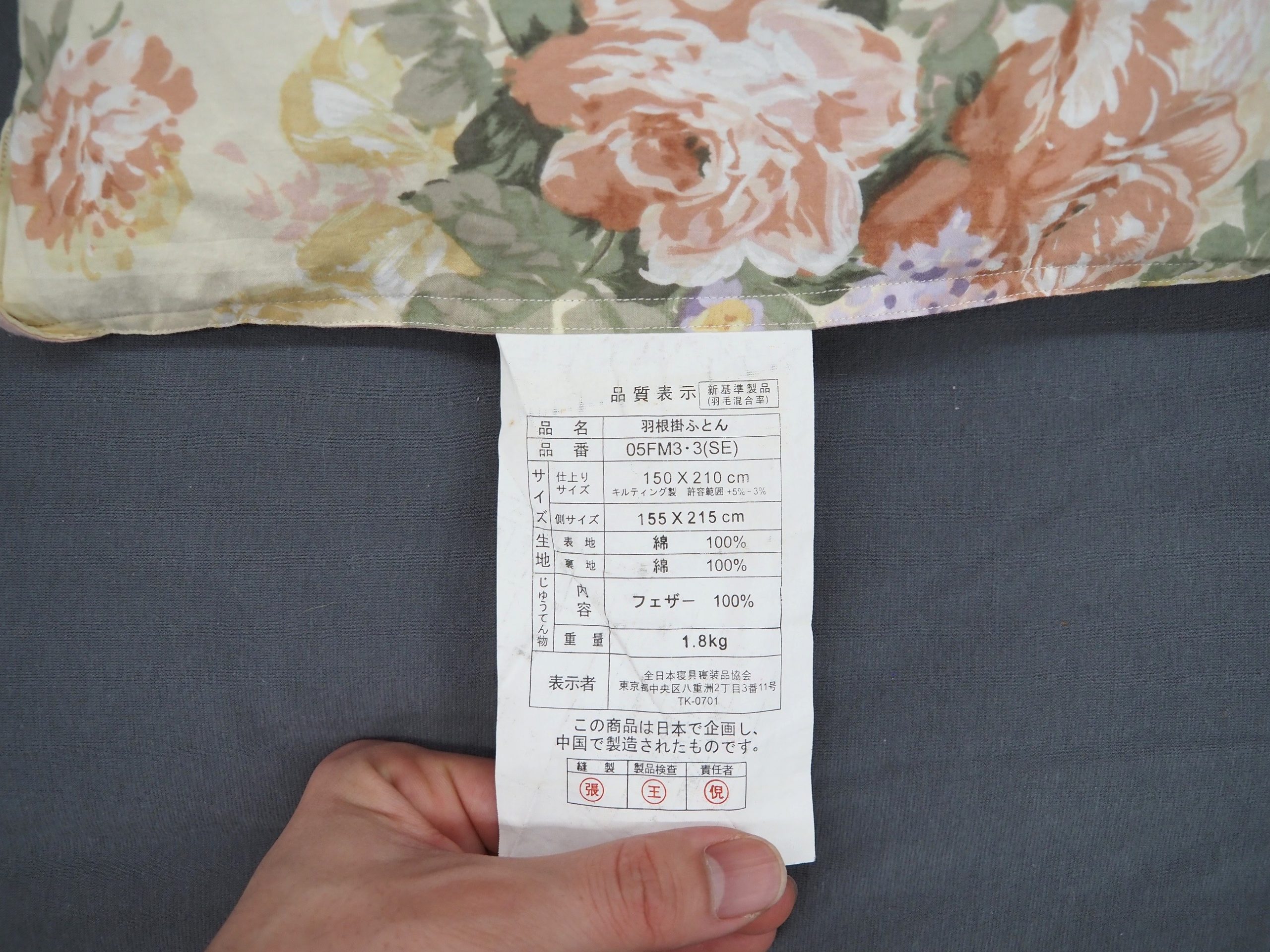 問題なのがこちらです。柄も鮮やかで、羽毛も良いかな?と思いましたが、ラベルをみるとフェザー100%。触ってみるとチクチクしました。フェザーは保温力がありませんので、この羽根布団はリフォーム出来ません。