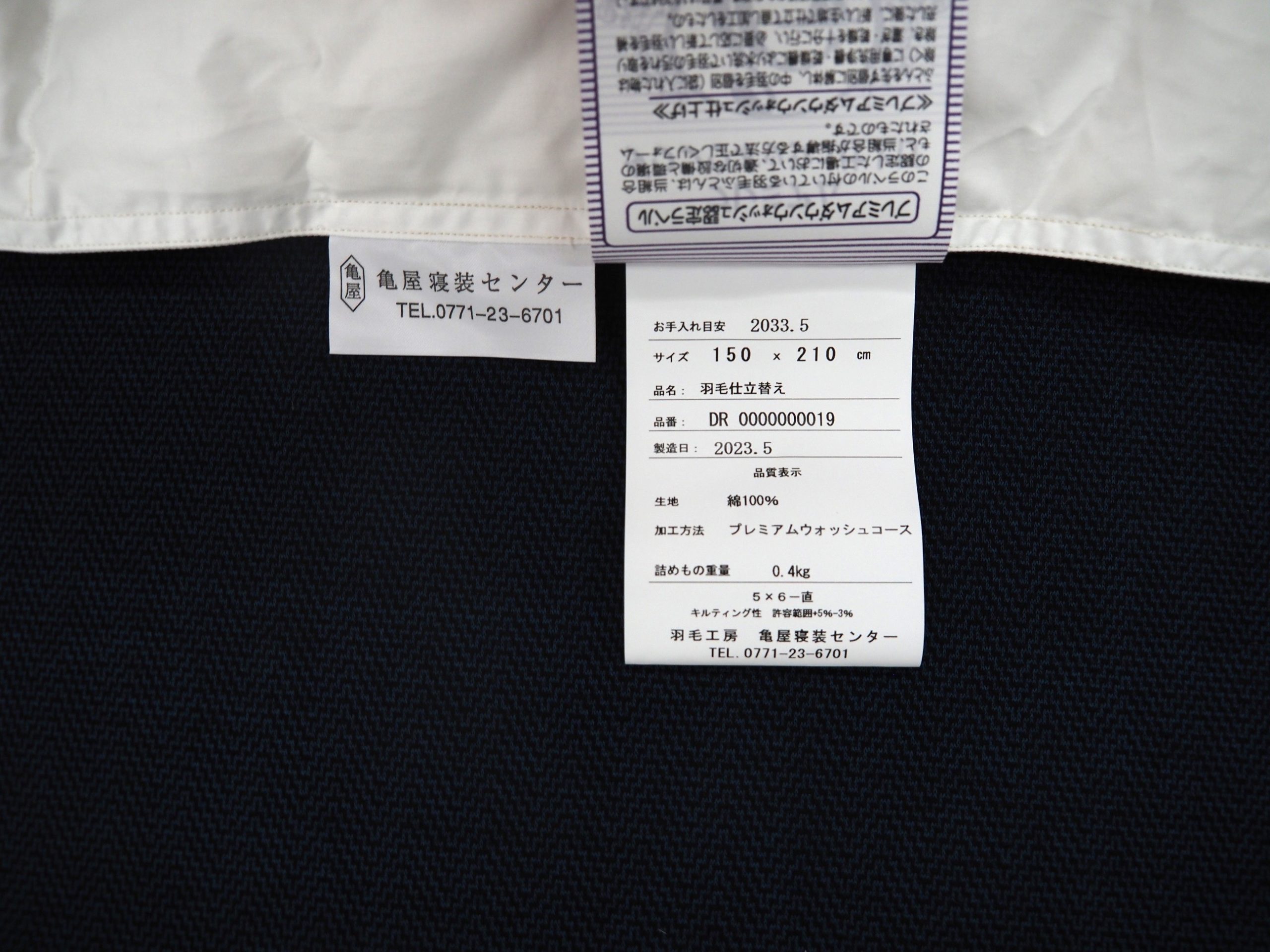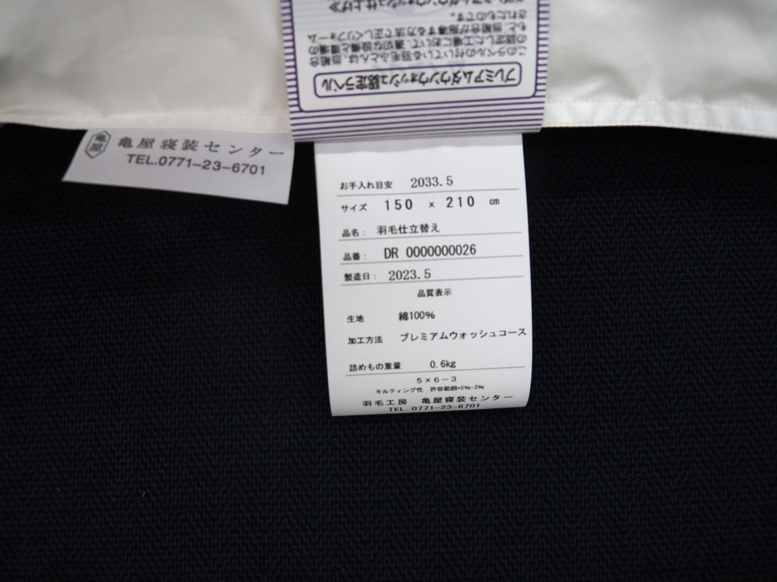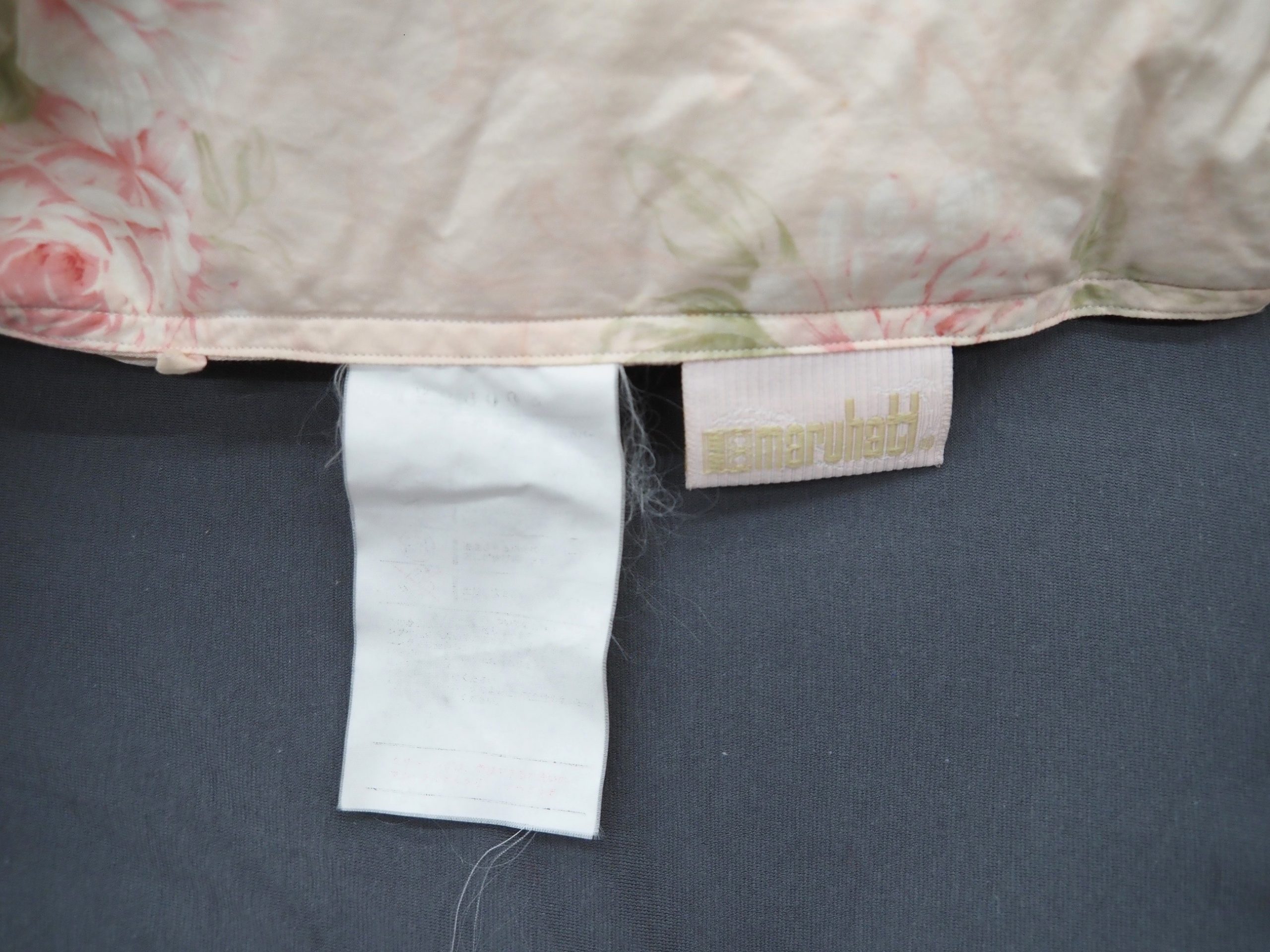 問題なのがこちらです。柄も鮮やかで、羽毛も良いかな?と思いましたが、ラベルをみるとフェザー100%。触ってみるとチクチクしました。フェザーは保温力がありませんので、この羽根布団はリフォーム出来ません。