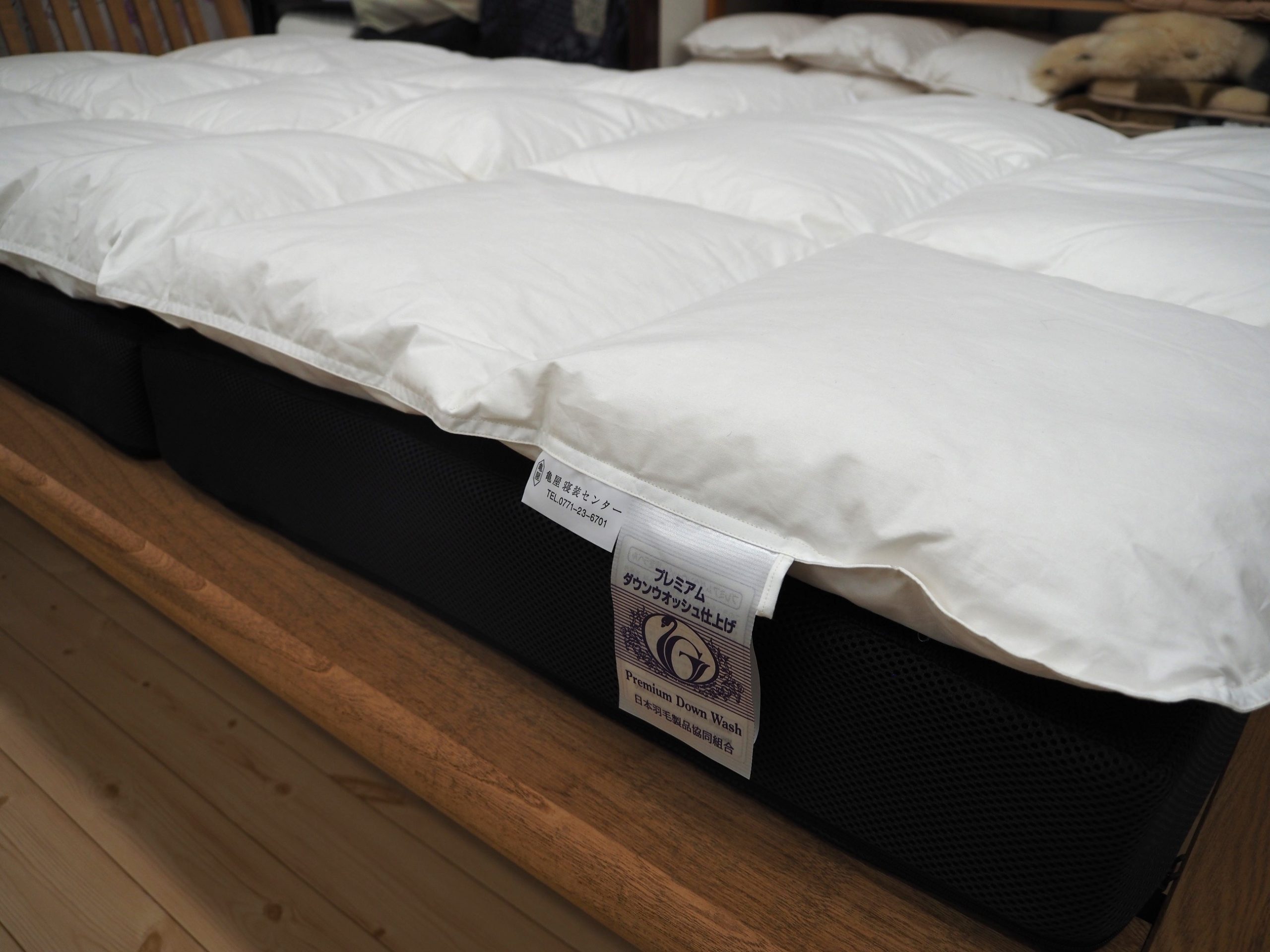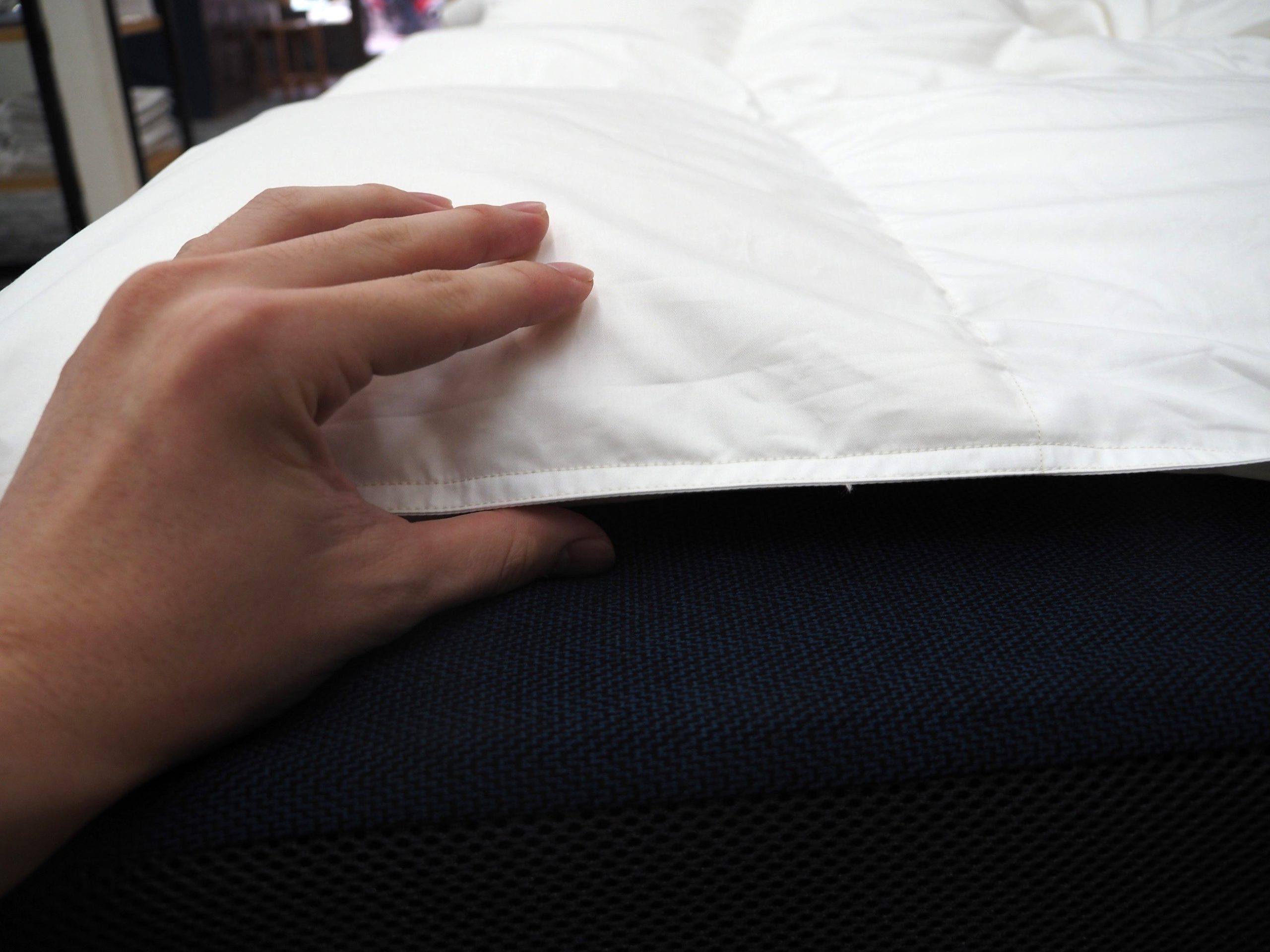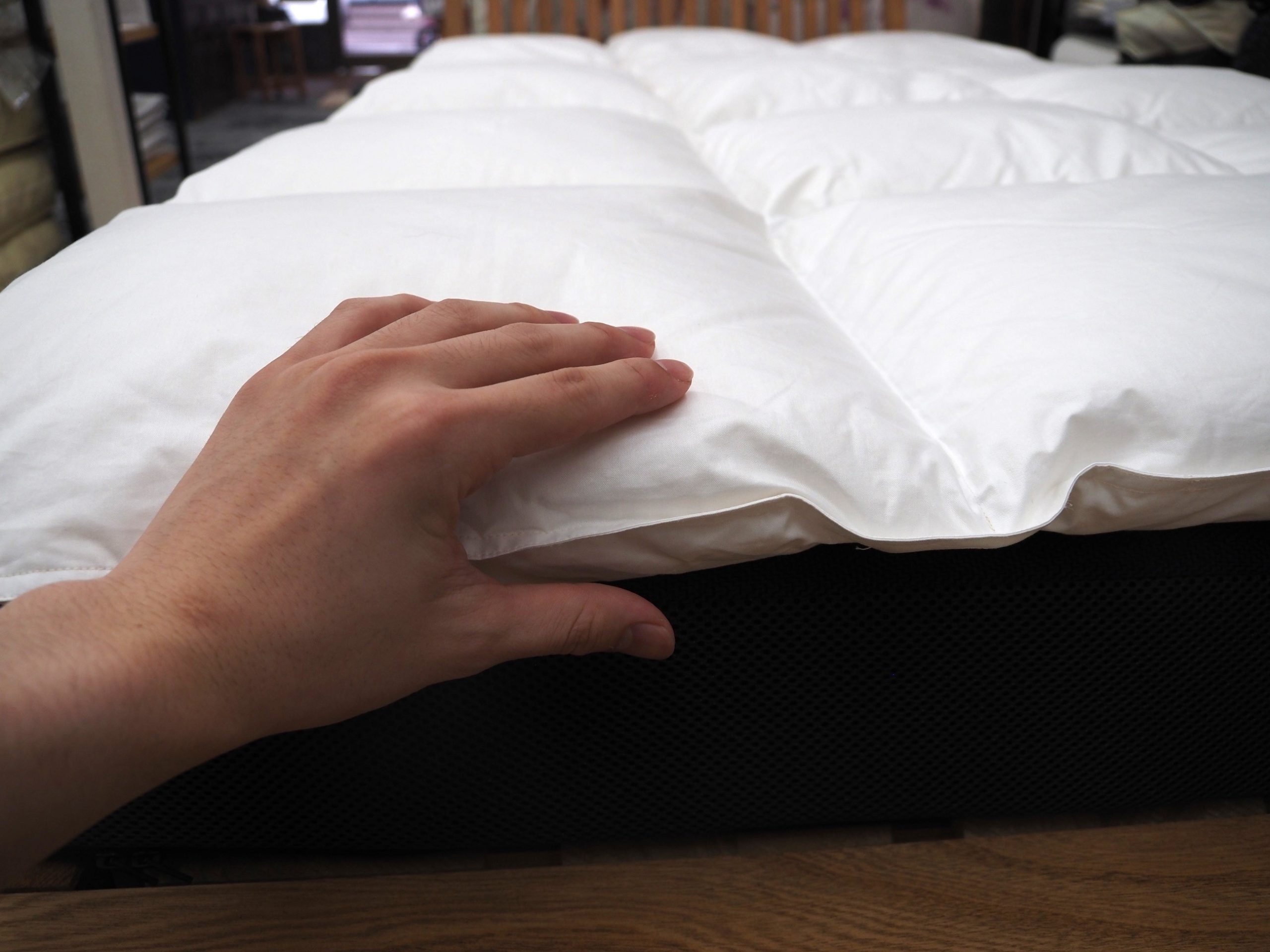最後にダウンパッド。洗える通気性の良い生地を使うことで暖かく蒸れにくい。ベッドマットレスの上に敷くことで身体の背中側の凹凸を吸収し、汗や湿気も逃がしてくれます。