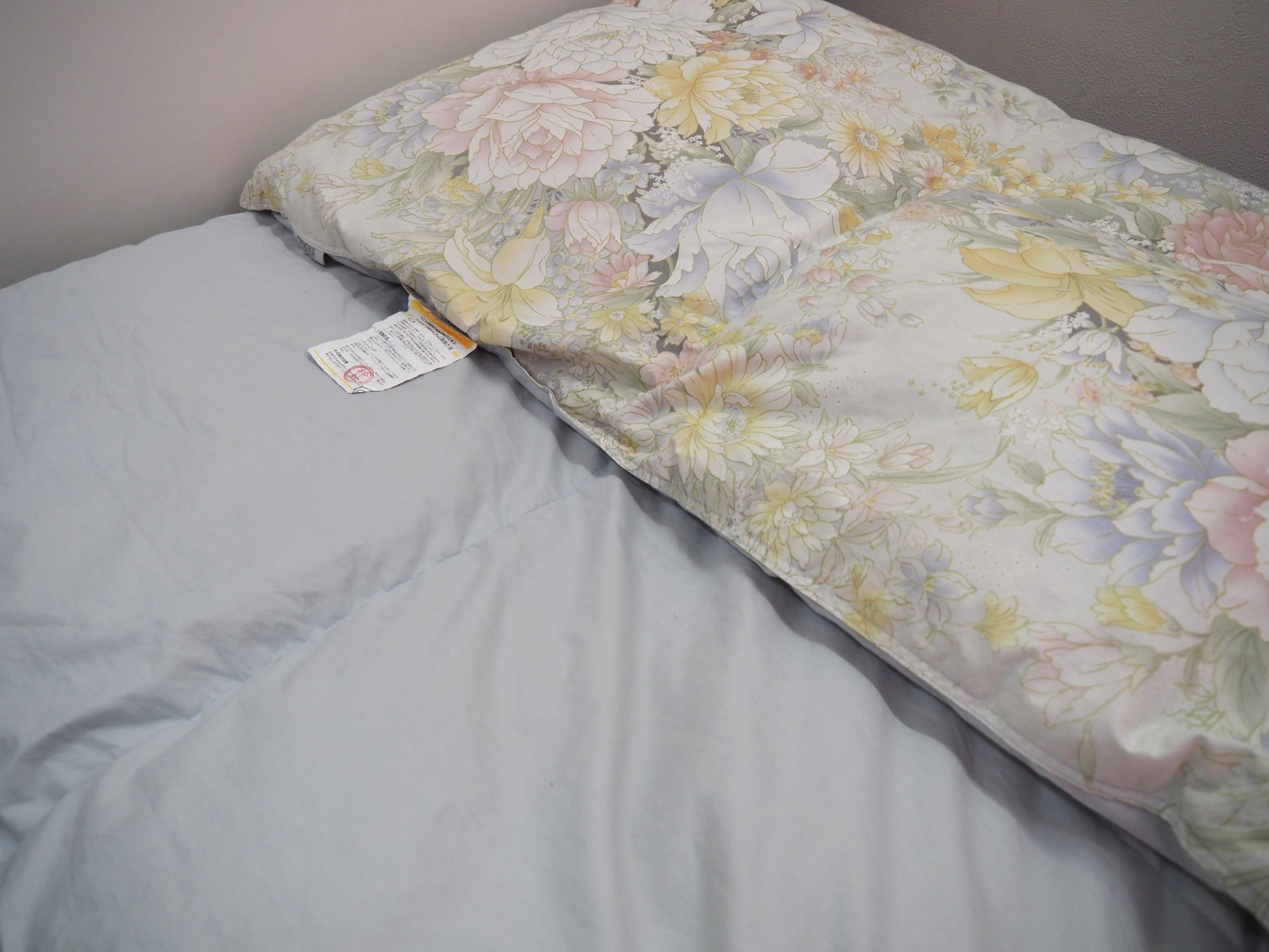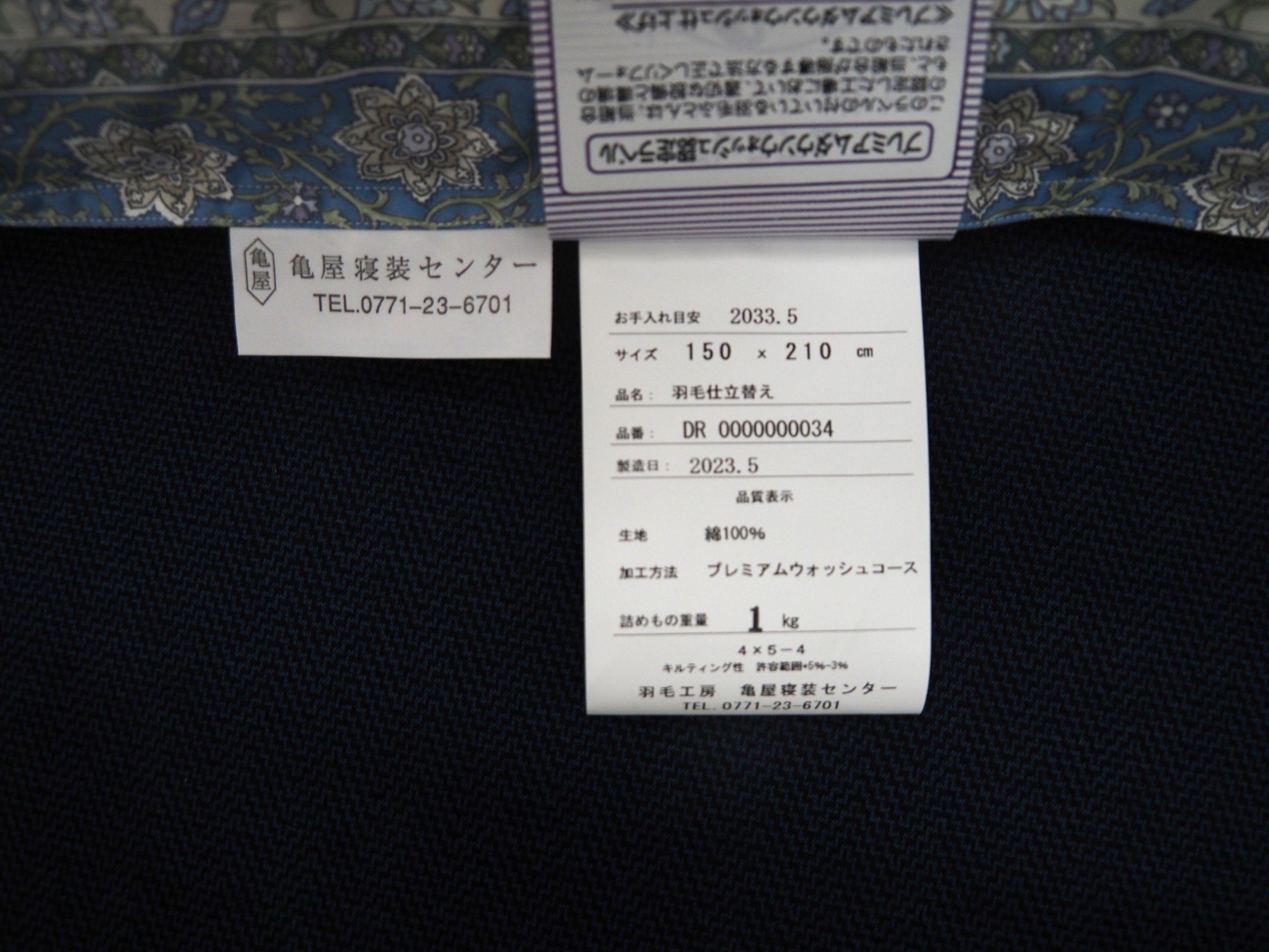 長岡京市の一軒家に住むM様より、昔からずっと使っている羽毛布団の嵩が減って暖かくなくなってきたので、羽毛布団リフォームできるなら羽毛を補充せずに合掛け布団に作りかえしたい。とご相談頂きました。