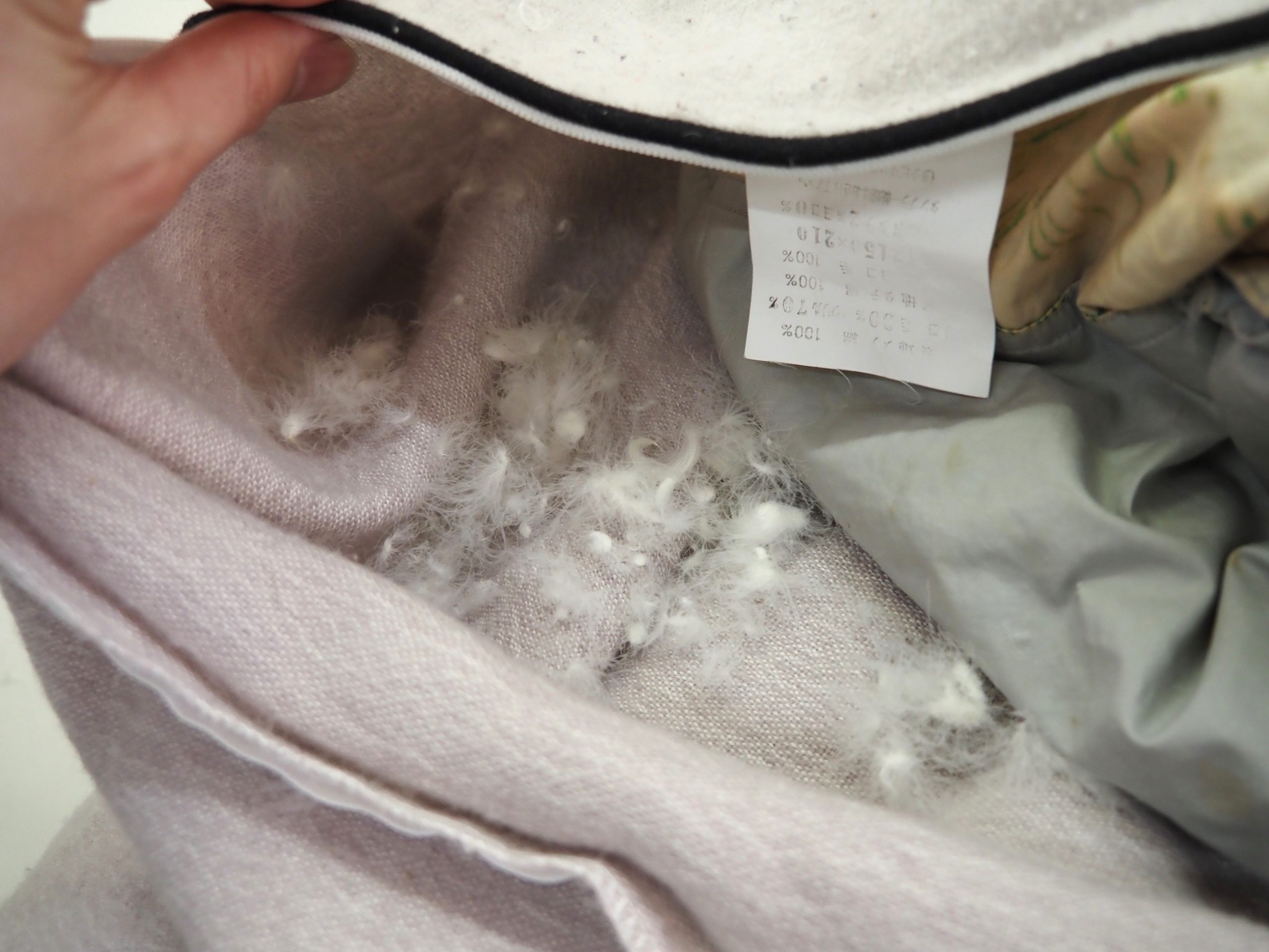 お預かりした羽毛布団は、カバーを取れないほど羽毛が出ていました。羽毛の状態は、何個も絡まり合い団子状になっているのが見受けられます。汗や湿気をかなり吸収していますが、羽毛自体が潰れているわけではないので、洗浄すればふっくら戻ります。