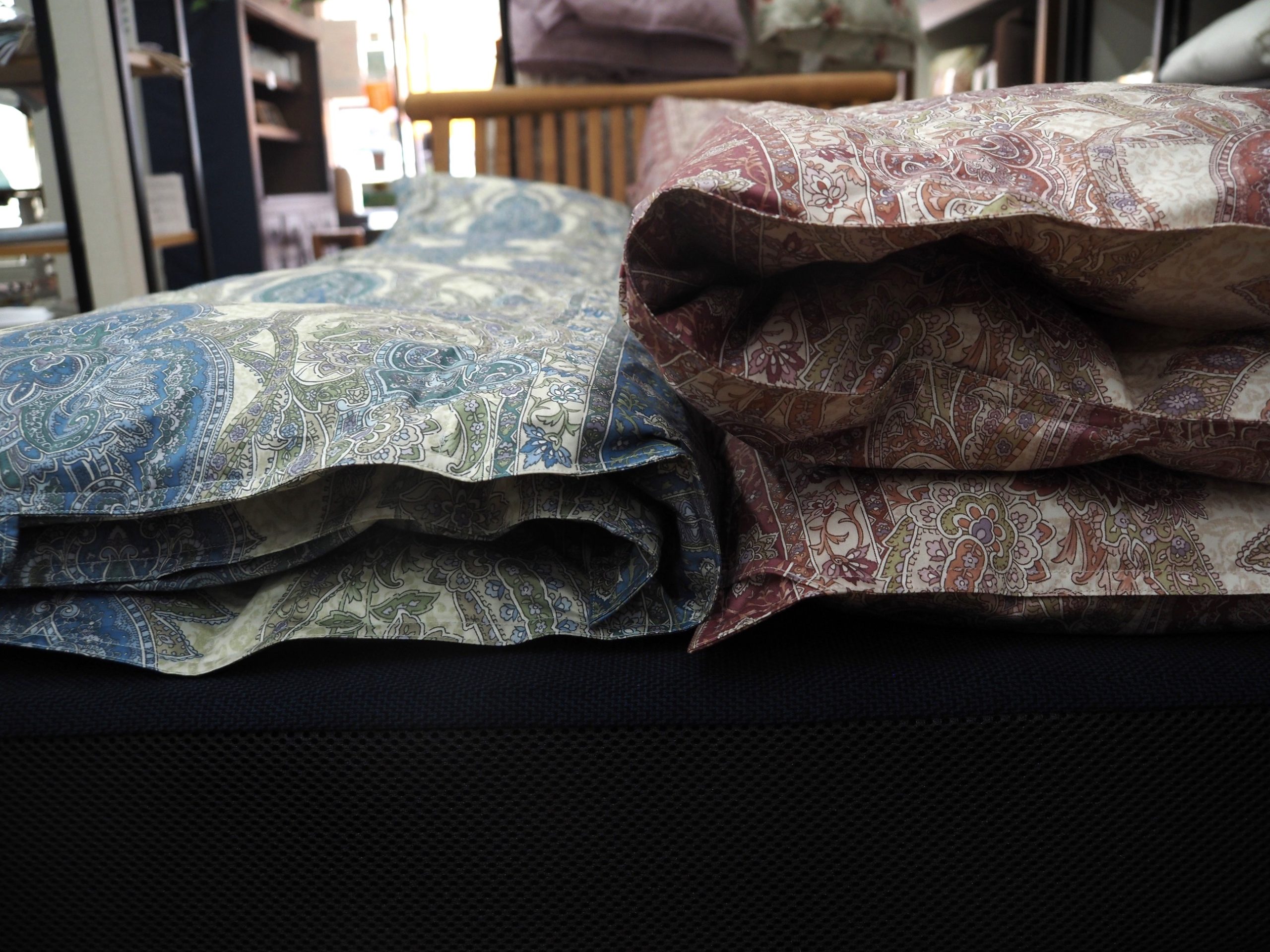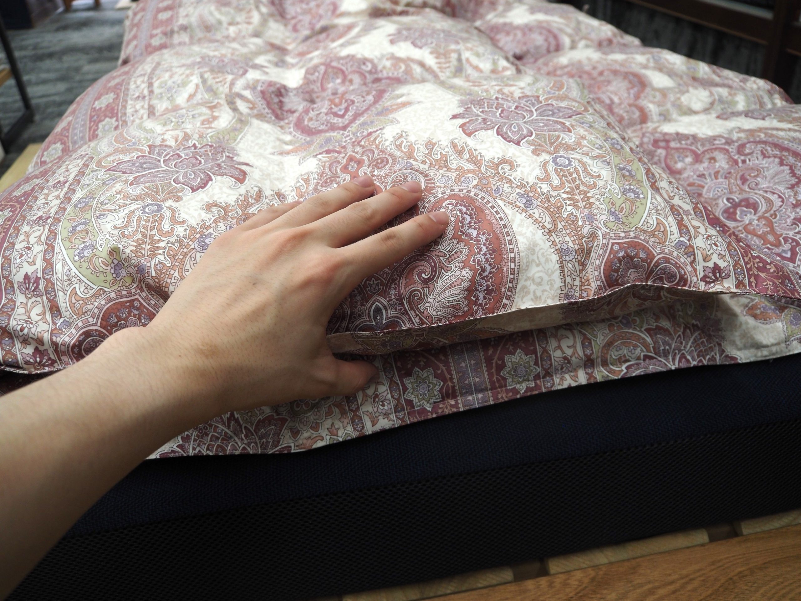 店内にある、合掛け布団と肌掛け布団のサンプルを見て頂きながら、羽毛量を決めて頂きました。色々見て、薄めの合掛け布団と薄めの肌掛け布団を作ることに。従来よりマスの細かい30マスにすることで添いやすくなりフィット性があがることもご提案させて頂きました。