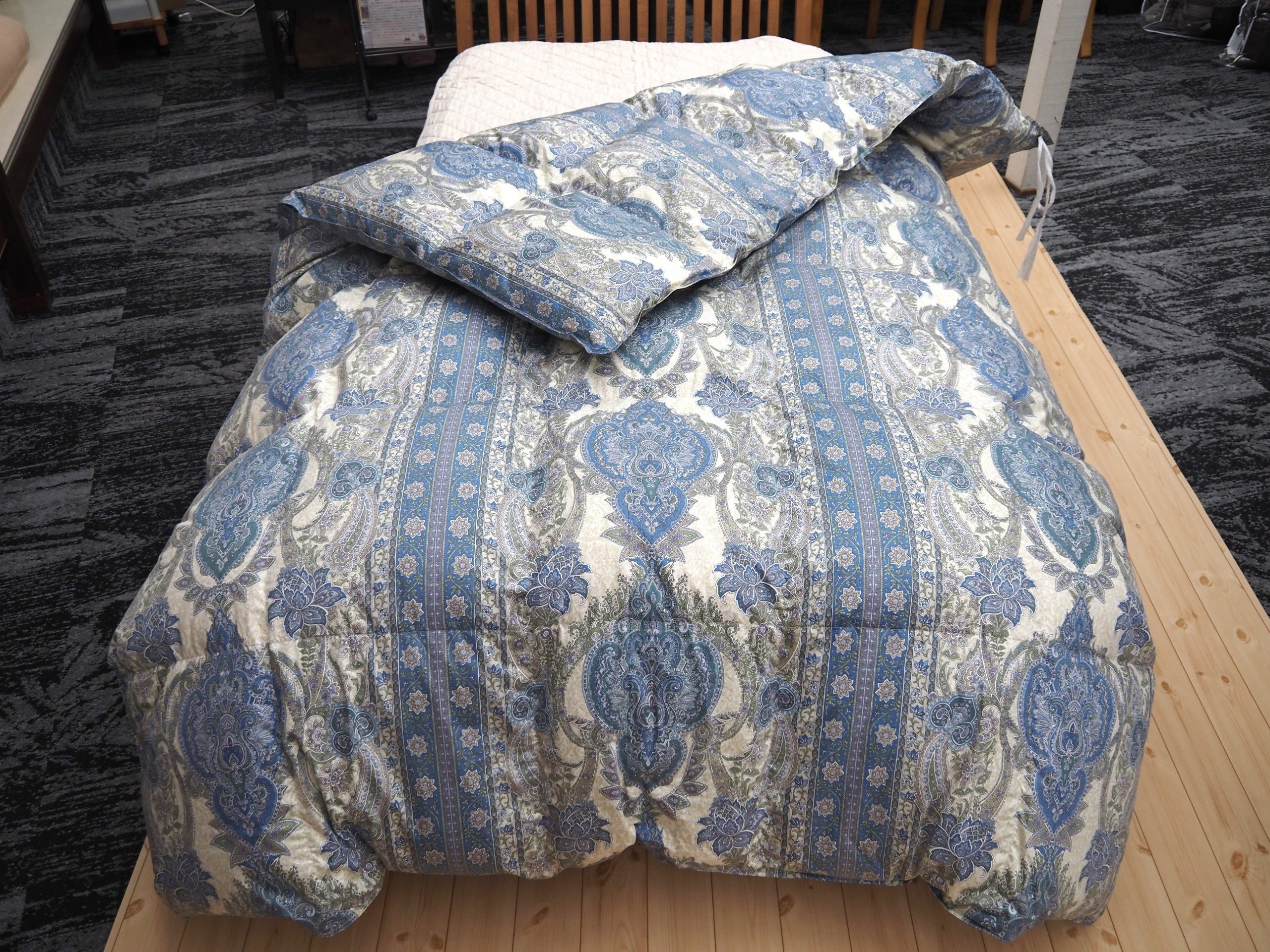 亀岡市の一軒家に住むM様より、30年前に購入した羽毛布団がリフォームできるなら、ボリュームがありすぎて真冬しか使えないので、量を減らして長い期間使える羽毛布団に作りかえたい。とご相談頂きました。
