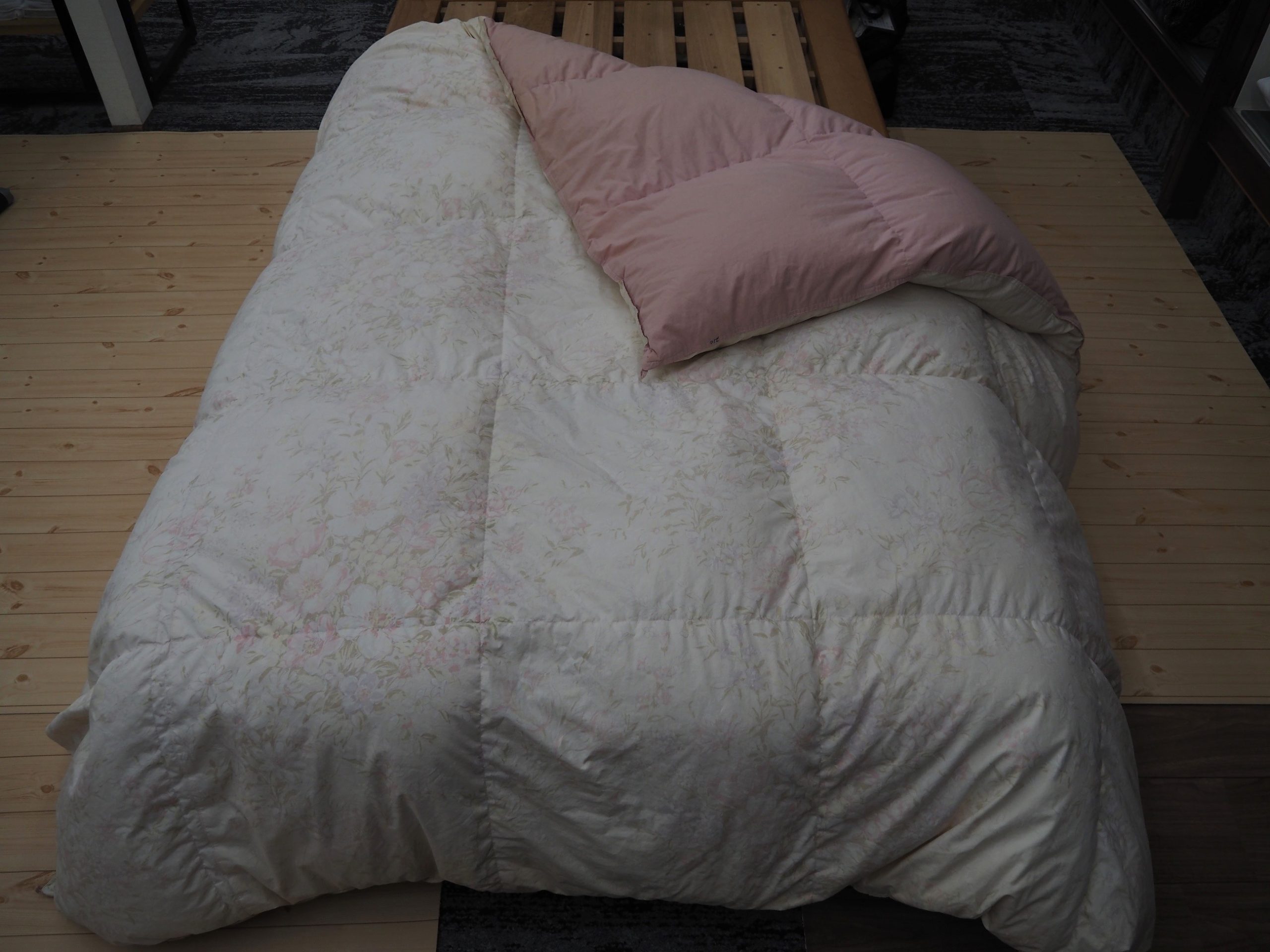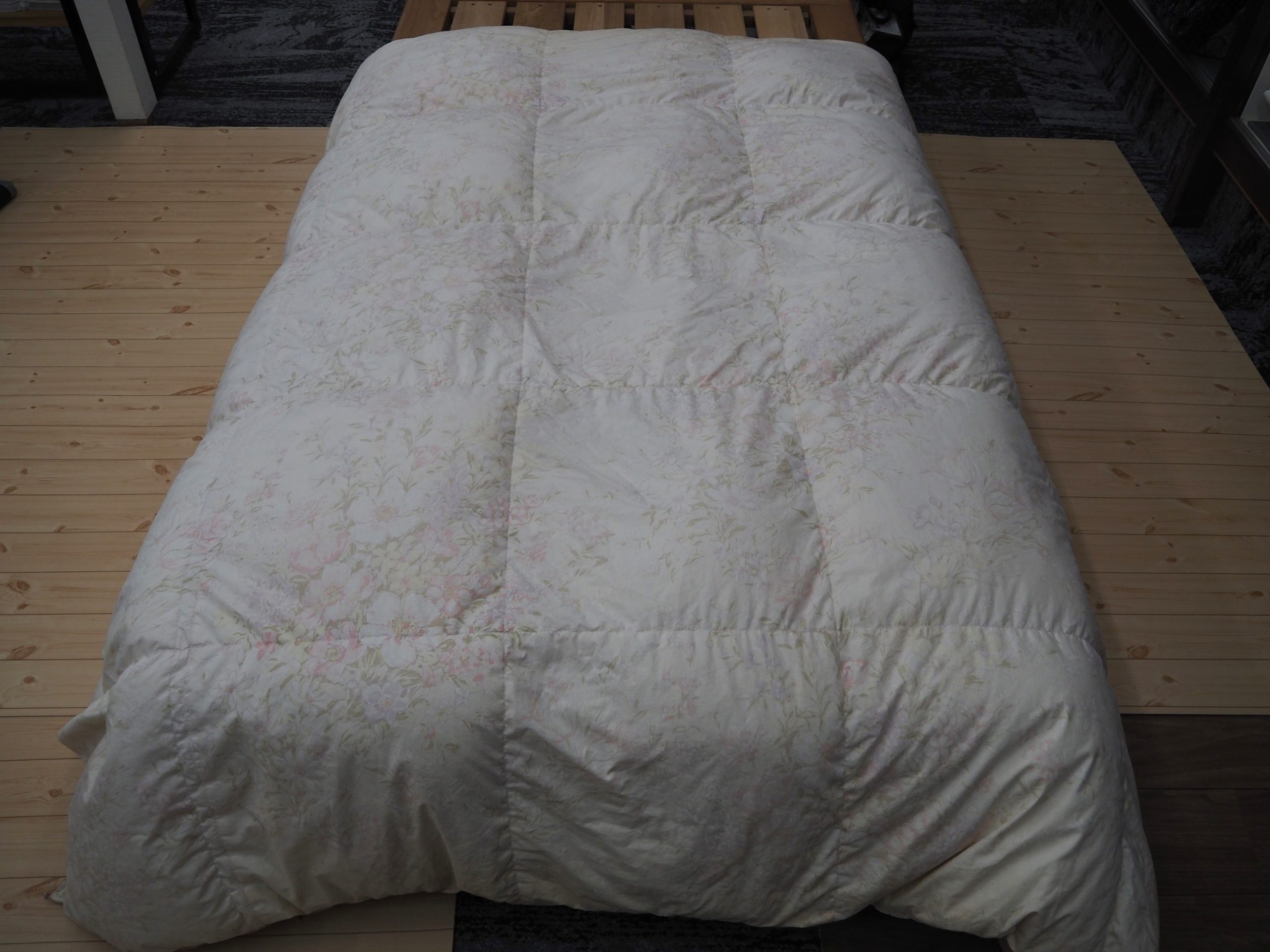 亀岡市の一軒家に住むI様より、25年ぐらい前の結婚した時に母親が持たせてくれた羽毛布団が、最近暖かくなくなってきたのでリフォームを考えているんですが、かなり古いのでリフォームできるかどうか一度羽毛を見て下さい。とご相談頂きました。
