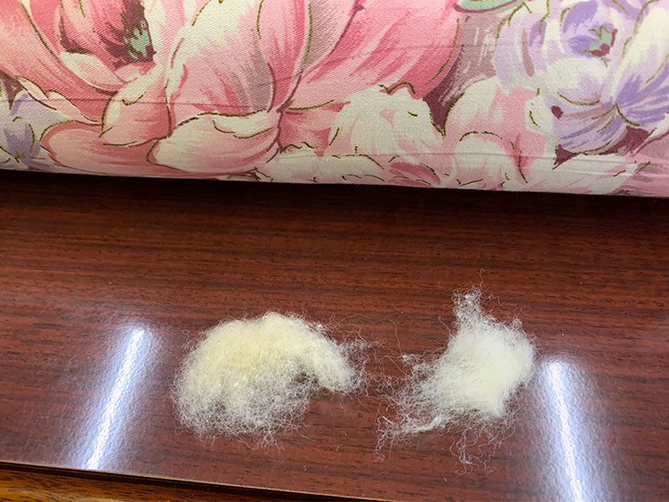 中身を空けて綿の状態を確認したところ、かなり元気が失われている状態でしたので、半分だけ打ち直して再利用し半分を新しい綿で作らせて頂くことにしました