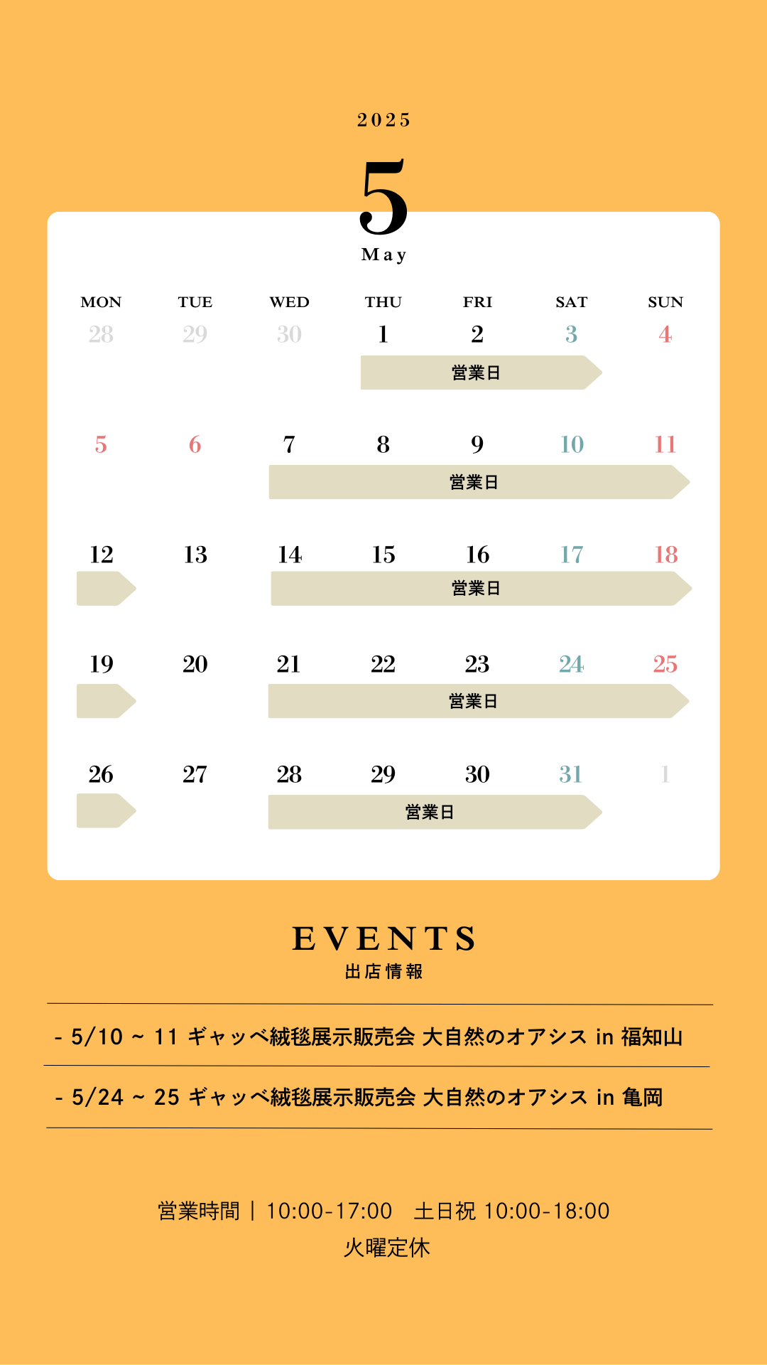 5月の営業時間とイベントです