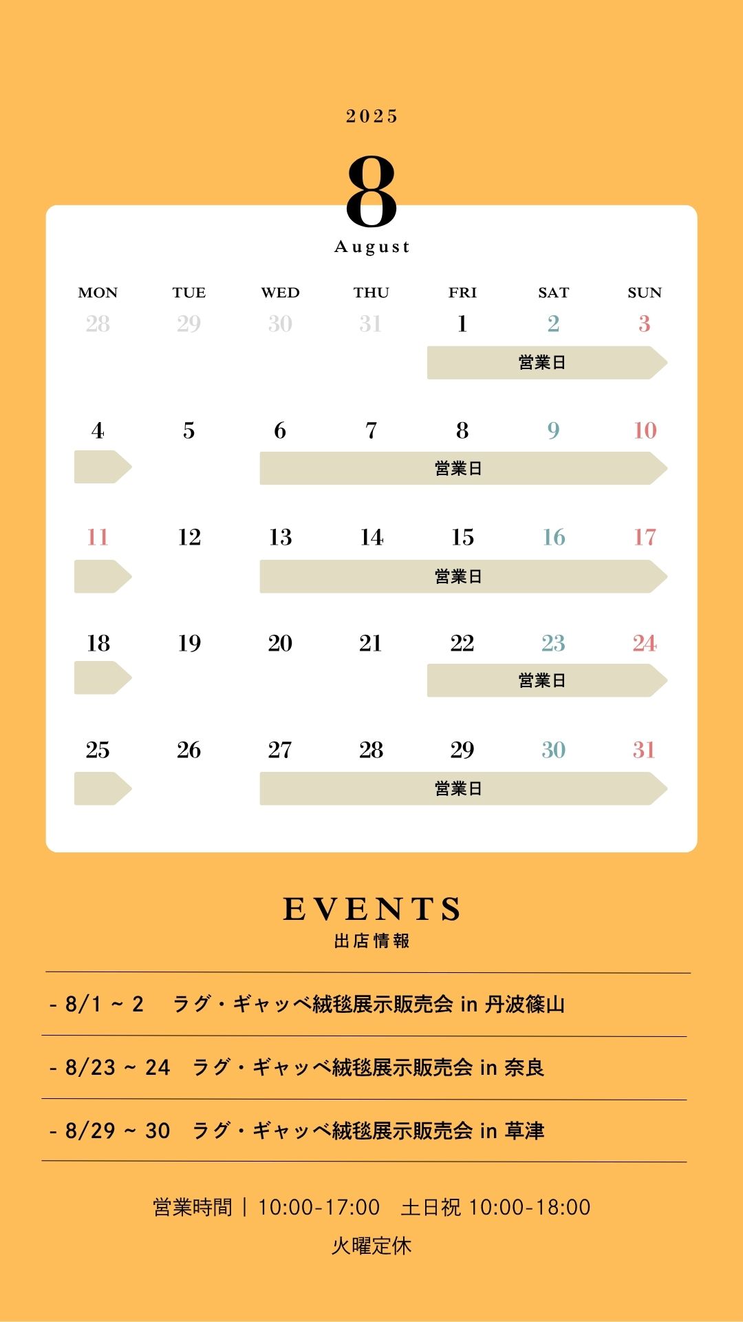 8月の営業時間とイベントですお盆休みを8/19~21で頂きますのでお間違いないようにお願いいたします。