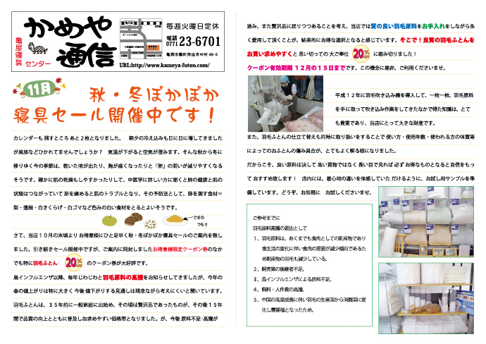 かめや通信 心地よい眠りのためのtips満載!かめや通信のバックナンバーをご覧いただけます。
