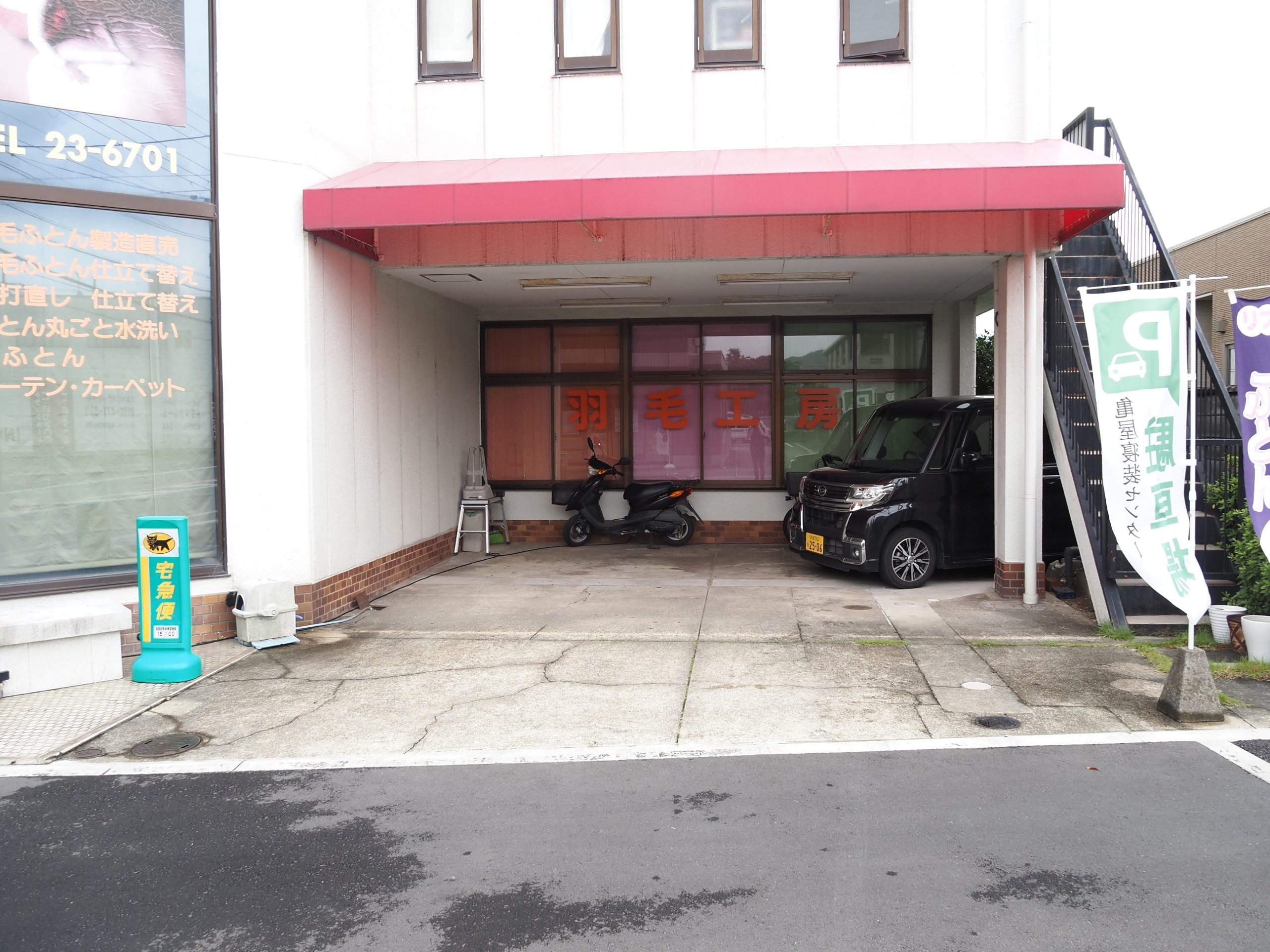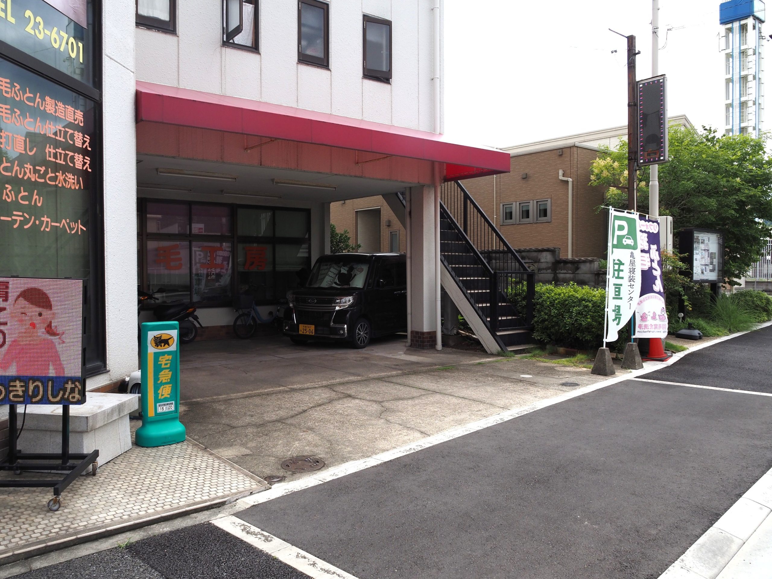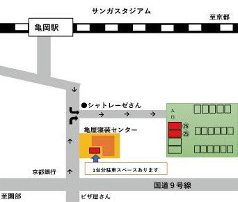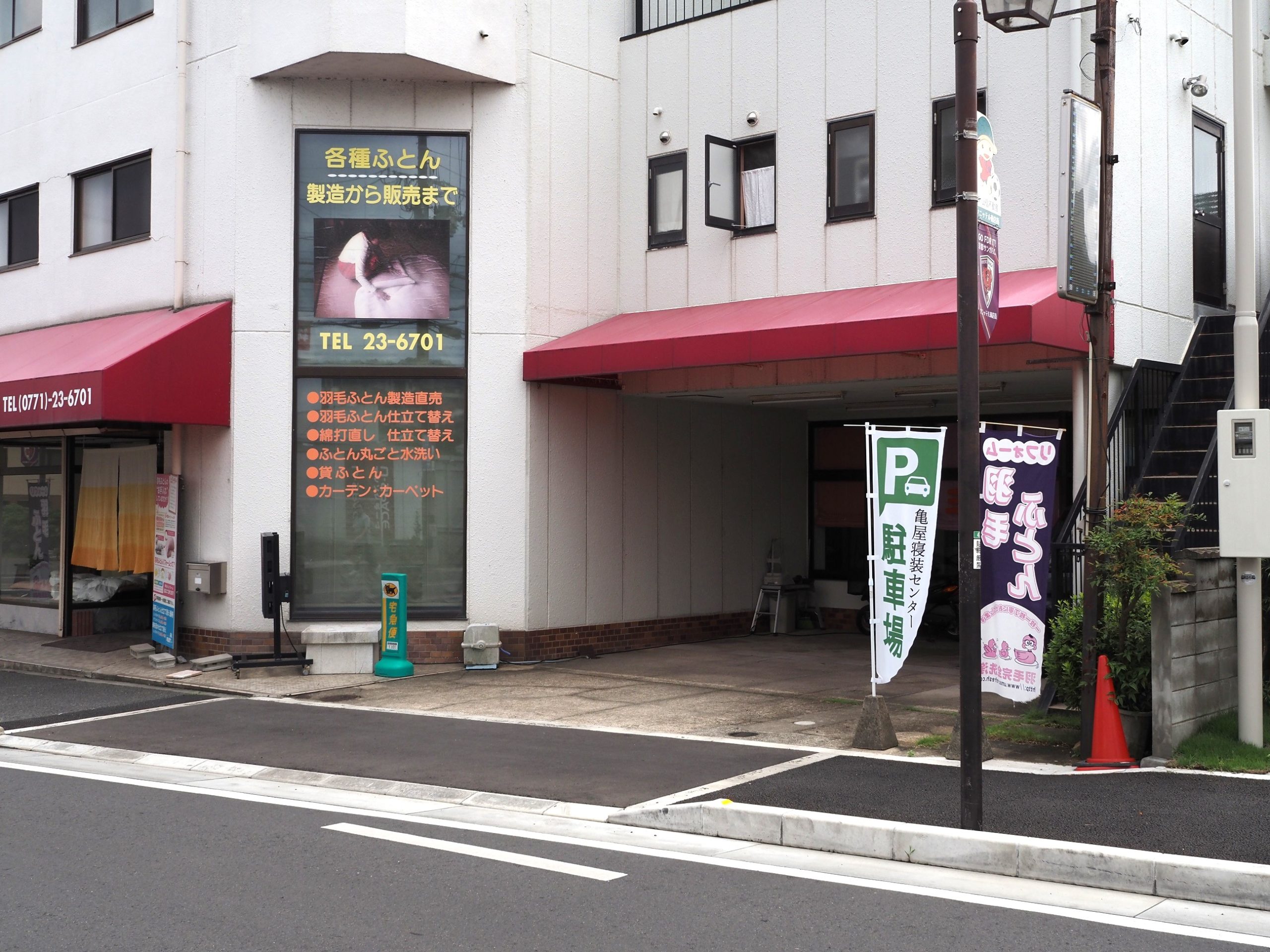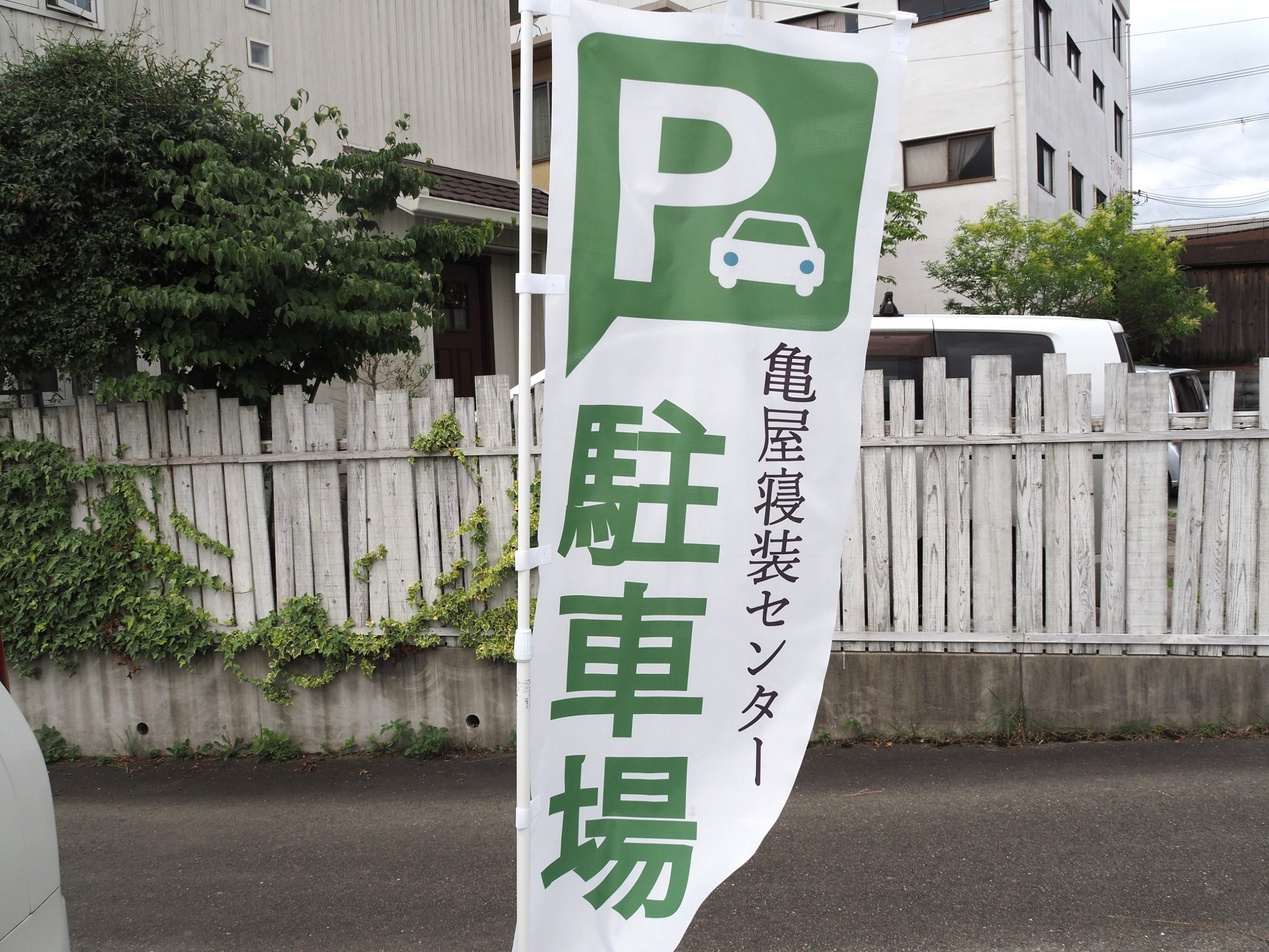 お車でお越しの際は、亀屋寝装センター敷地内にある駐車場(1台)、又は徒歩1分にある駐車場(2台)をご利用下さいませ。