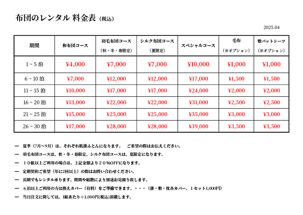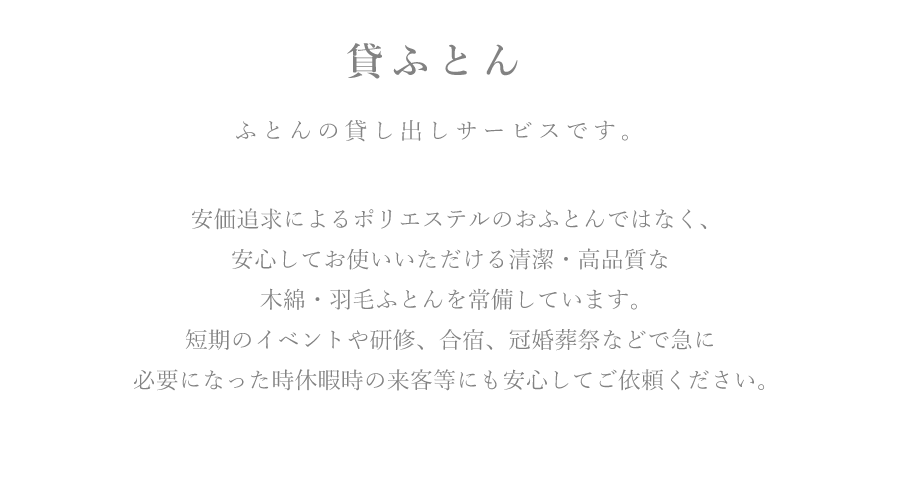 用途に合わせてレンタルする布団の種類をお選び頂けます。布団屋の布団でぐっすり睡眠を取りたいって日々の癒しを求める方も、、