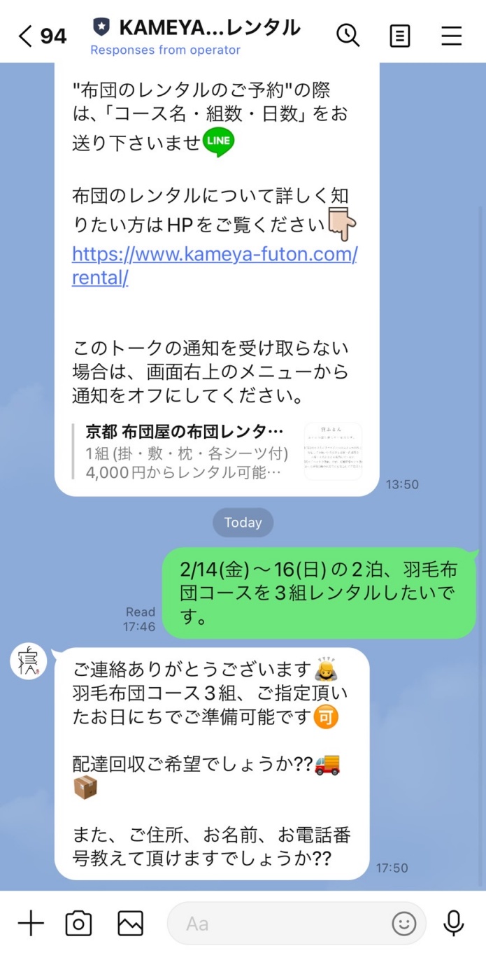 コース・組数・日数をお聞きして在庫があればお客様情報(ご住所・お名前・お電話番号)をお伺いします。