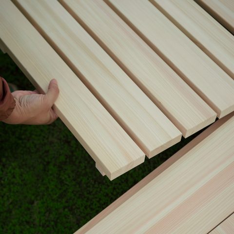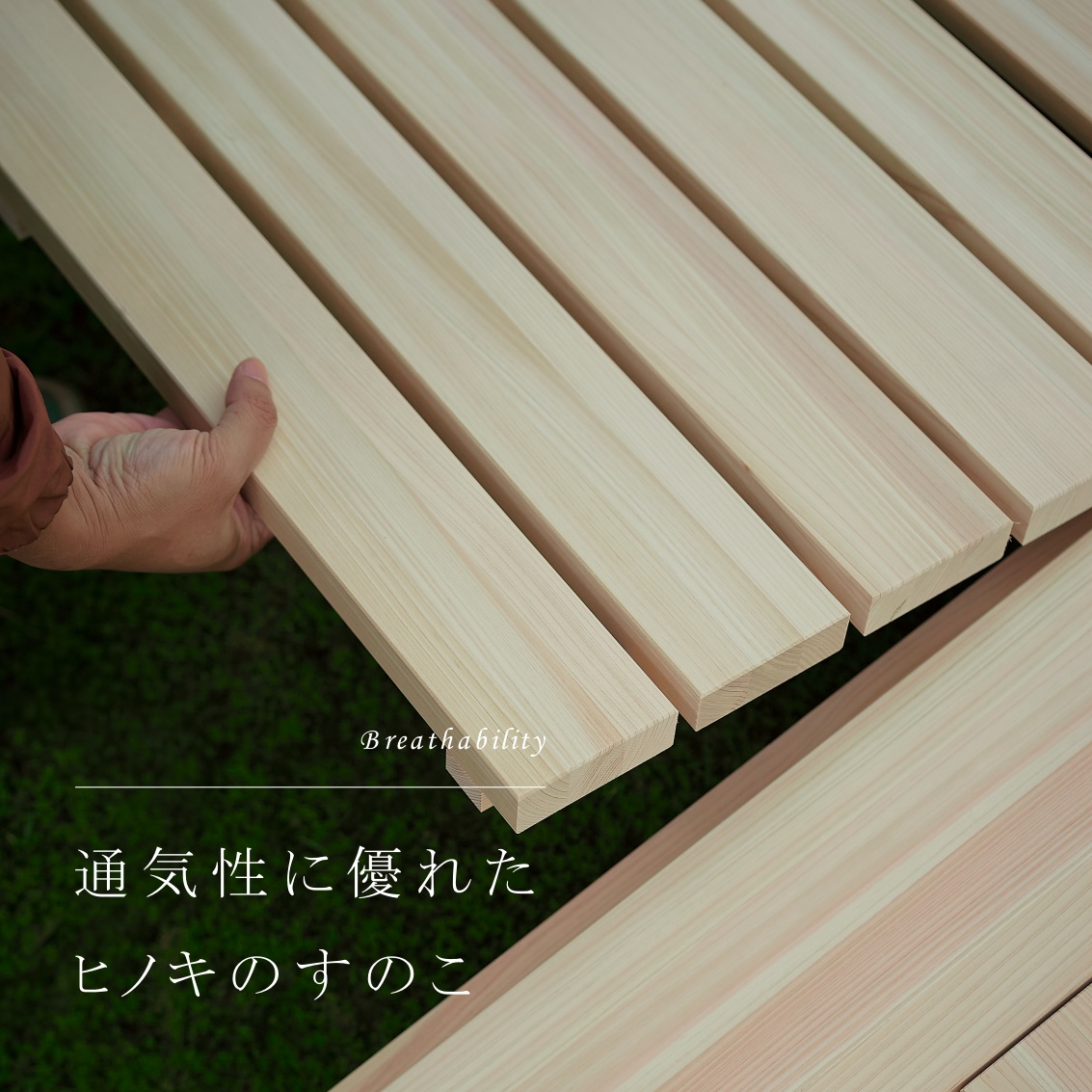 ヒノキの良さを伝えたいからこそ無塗装仕上げにこだわっています。小さなお子様のいる家庭でも安心。フロア下に湿気を逃がし通気性も確保。清潔で心地よい眠りをサポートします。