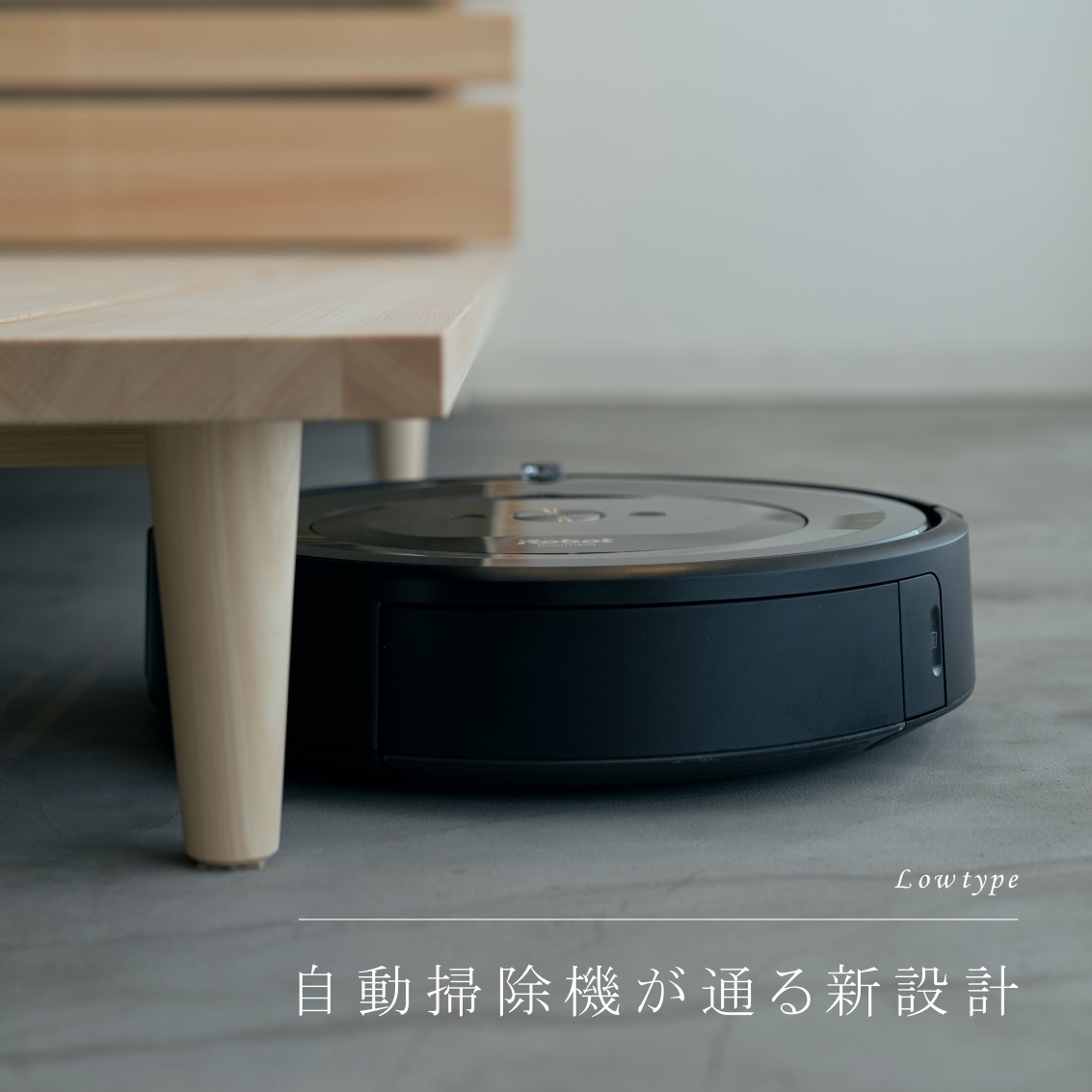 ロータイプデザインながらも床下に自動掃除機が通るほどの高さを設けました。湿気を逃す通気性プラス、自動掃除機で年中清潔感のあるすっきりした寝室を実現。
