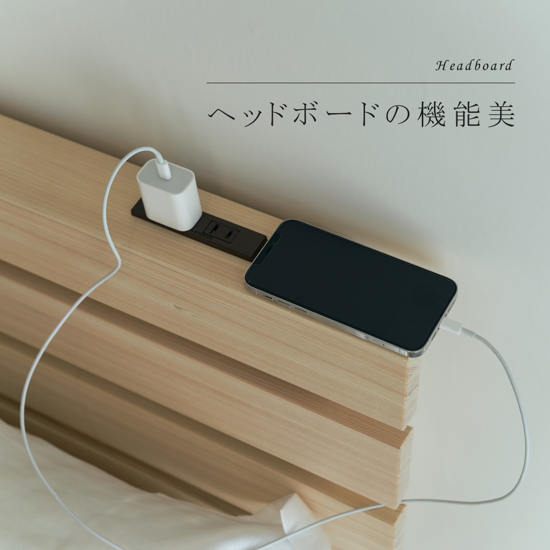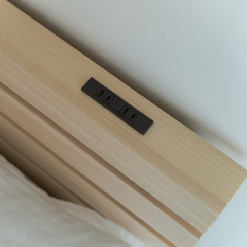 スマートフォンやタブレットなどの充電に便利なコンセントが二口付。また、スリムなヘッドボードには、置き型時計、アロマディフューザーなどを置いて自分だけの寝室インテリアをお楽しみいただけます。