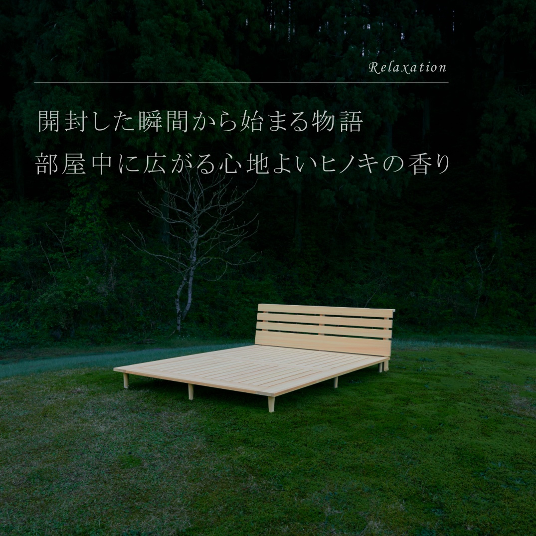 開封した瞬間からヒノキの豊かな香りや温もりが部屋中に広がり、まるで森林浴をしているような感覚に。ゆったりとベッドに横たわりながら一日の疲れを癒す、そんなひとときを過ごしてほしいという想いで制作されています。
