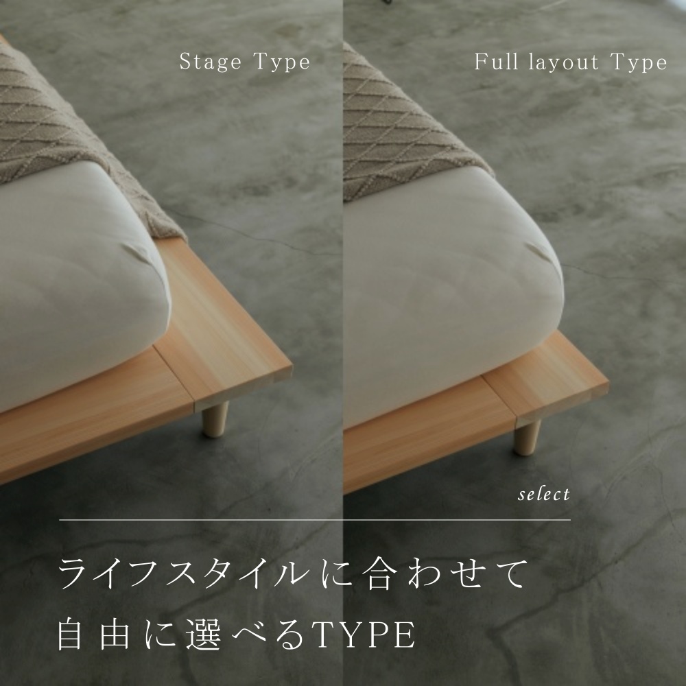 マットレス幅よりフレーム幅を大きくすることでステージタイプとなり、両サイドに小物が置けたり、ワンランク上の存在感のあるデザインを演出することができます。