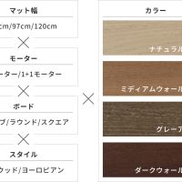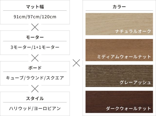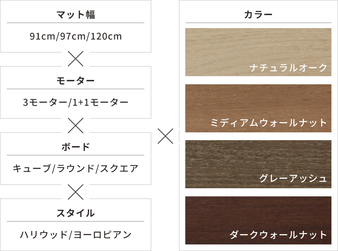 サイズ(マット幅)・機種(モーター)・ボード・スタイル・カラーを、用途や好みに合わせてお選びいただけます。