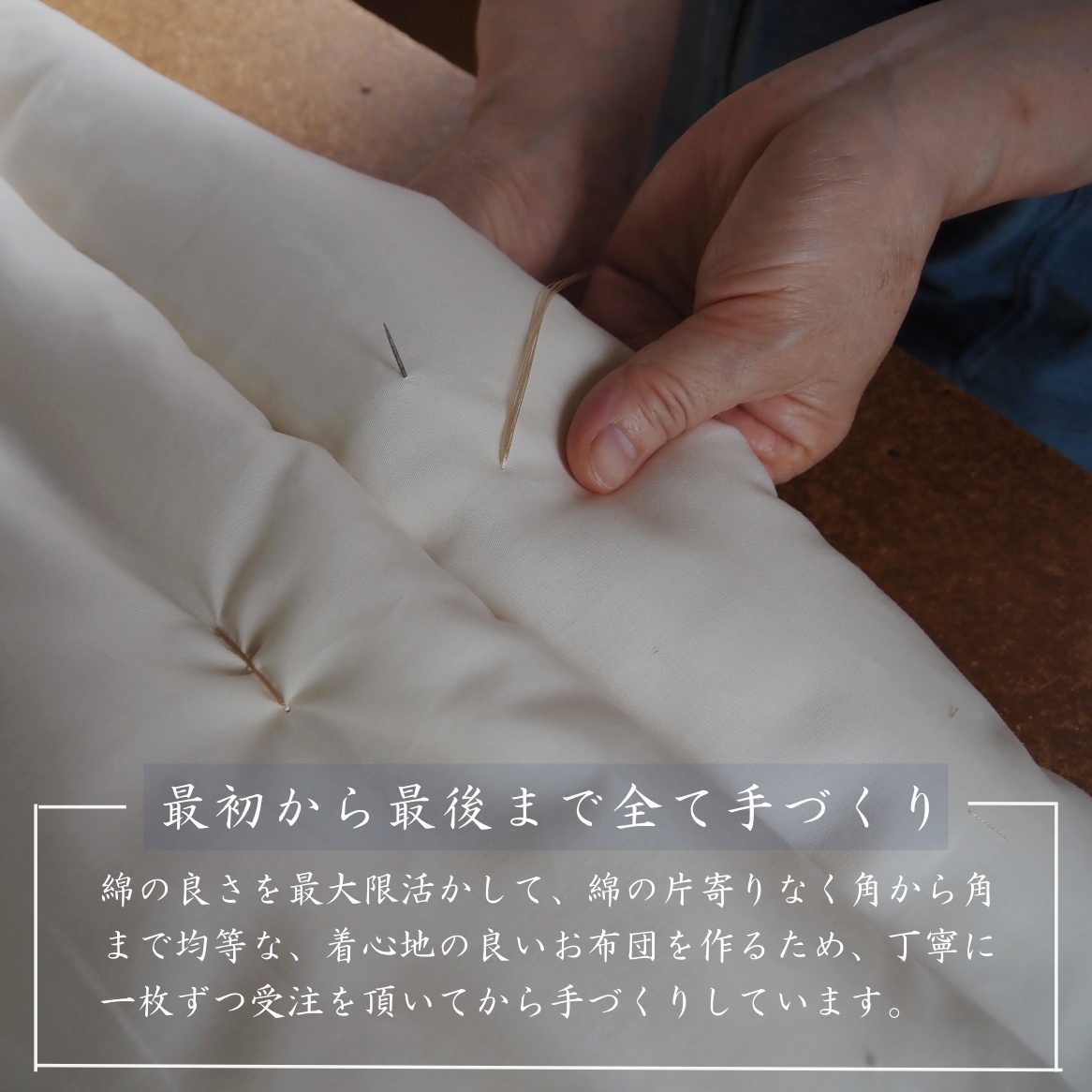 綿の良さを最大限活かして、綿の片寄りなく角から角まで均等な、着心地の良いお布団を作るために、丁寧に一枚ずつ受注を頂いてから手づくりしています。