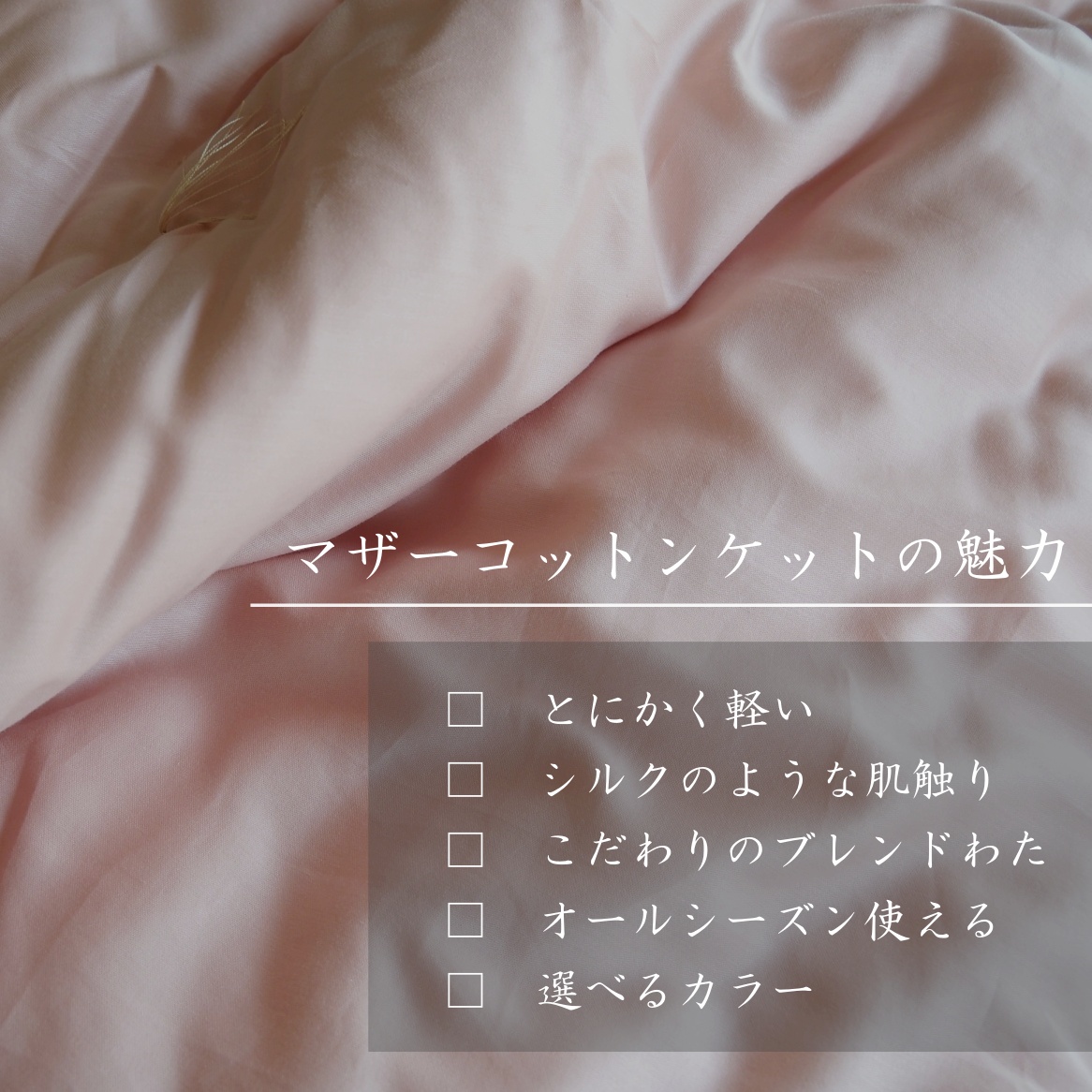マザーコットンケットが選ばれる理由は、羽毛肌掛け布団と同じぐらいの軽さで、より柔らかくより肌触りがいいから。