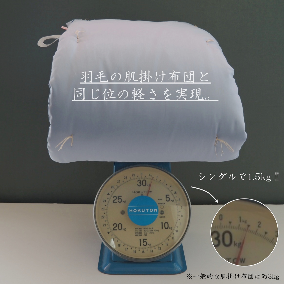 総重量は1.5kg!! 羽毛の肌掛け布団と同じ位の軽さを実現。