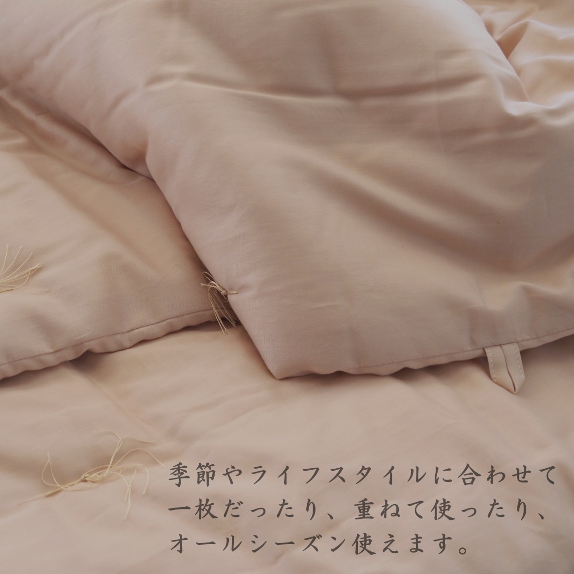 夏だけでなく、季節の変わり目、冬にも使えるオールシーズンケット。冬は、羽毛合掛け布団と一緒に内側に使うのがおすすめ!