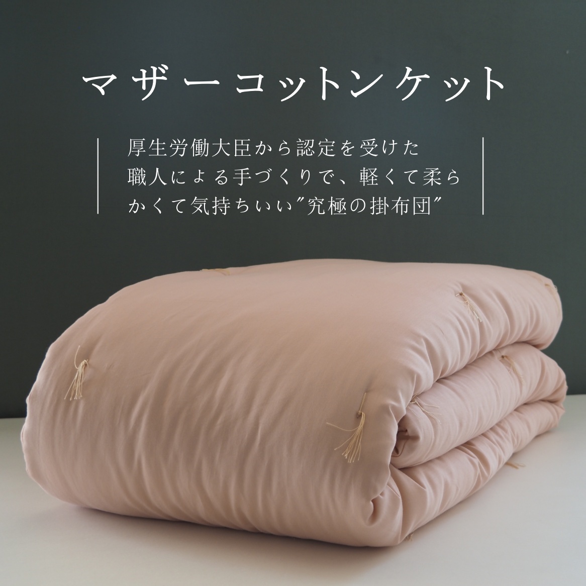 マザーコットンケットは、厚生労働大臣から認定を受けた職人による手づくりで、軽くて柔らかくて気持ちいい究極の掛布団です。